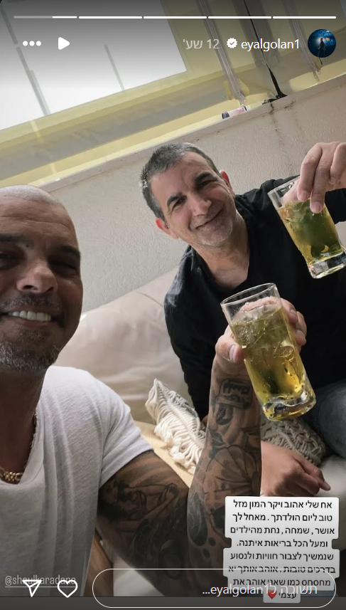 גולן העלה סטורי עם חברו הטוב שאול קראדנה מרחובות, ואיחל לו מזל טוב לכבוד יום הולדתו: "אח שלי אהוב ויקר המון מזל טוב ליום הולדתך. מאחל לך אושר, שמחה, נחת מהילדים ומעל הכל בריאות איתנה. שנמשיך לצבור חוויות ולנסוע בדרכים טובות. אוהב אותך יא מחסוסו כמו שאני אוהב את עצמי".