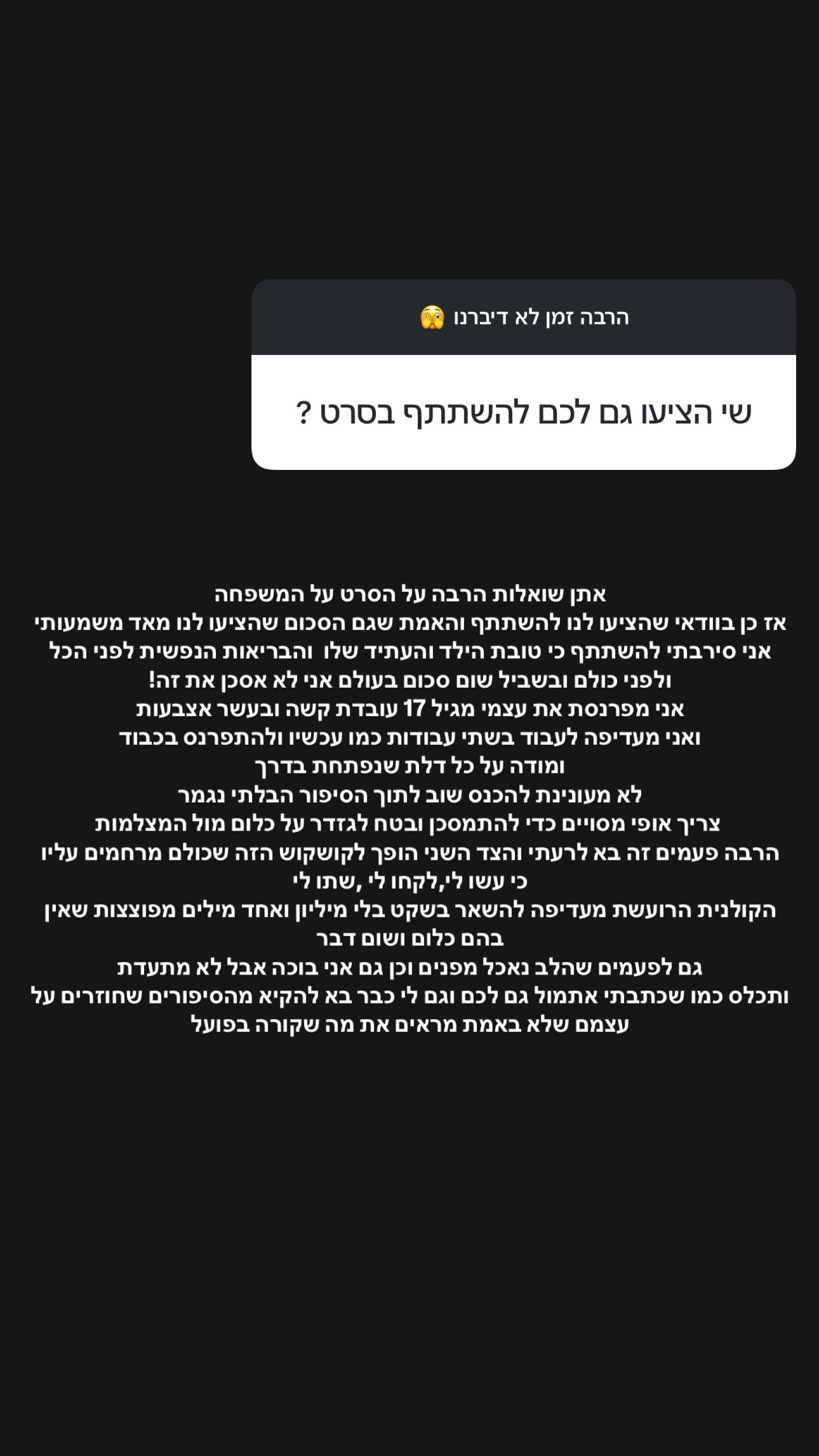 בהמשך הסטורי, כתבה פליטת הריאליטי: "אני מפרנסת את עצמי מגיל 17, עובדת קשה ובעשר אצבעות. אני מעדיפה לעבוד בשתי עבודות כמו עכשיו ולהתפרנס בכבוד ומודה על כל דלת שנפתחת בפניי".
