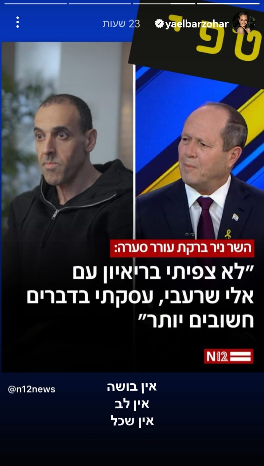 בסטורי נוסף ששיתפה באינסטגרם, המשיכה בר זוהר בטון הביקורתי כלפי שר הכלכלה והתעשייה וכתבה: "באמת שכל פעם הרמה יותר ויותר נמוכה. תתבייש לך ה'שר' ברקת".
