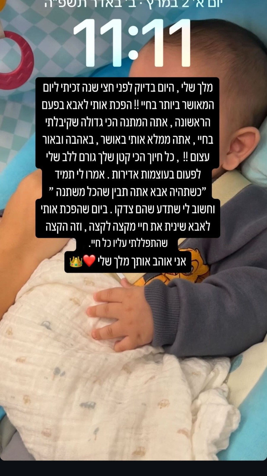עוד כתב בורגיל: "אתה ממלא אותי באושר, באהבה ובאור עצום! כל חיוך הכי קטן שלך גורם ללב שלי לפעום בעוצמות אדירות. תמיד אמרו לי; 'כשתהיה אבא, אתה תבין שהכל משתנה' וחשוב לי שתדע שהם צדקו. ביום שהפכת אותי לאבא, שינית את חיי מהקצה לקצה. זה הקצה שהתפללתי אליו כל חיי. אני אוהב אותך מלך שלי".