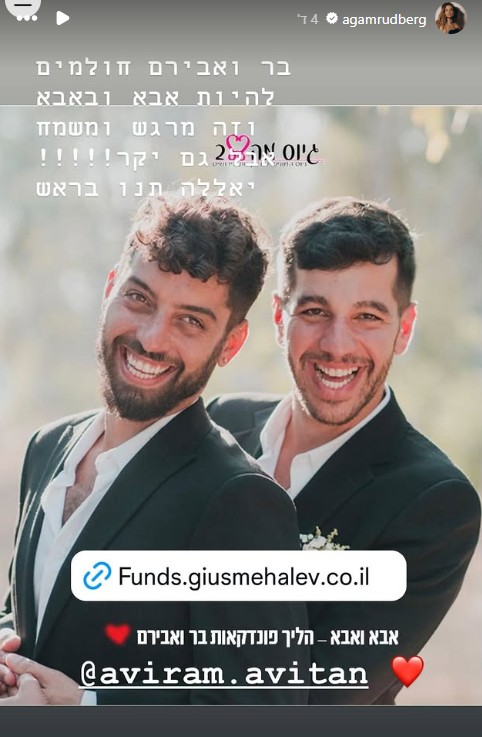 רודברג שיתפה סטורי מרגש במיוחד בו כתבה: ''בר ואבירם חולמים להיות אבא ובאבא. וזה מרגש משמח אבל גם יקר!!!! יאללה תנו בראש'' ושיתפה את תיבת התרומות לשניים שרוצים לבצע הליך פונדקאות כדי להפוך להורים