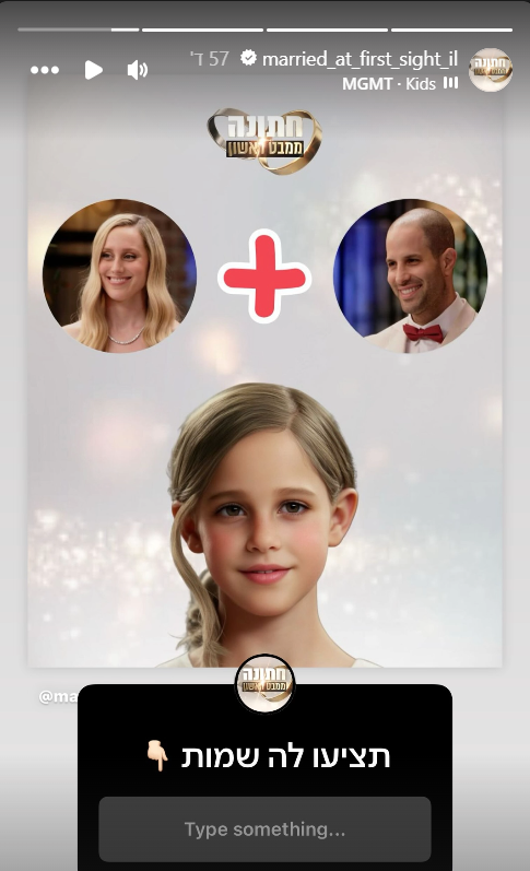 בחשבון האינסטגרם של "חתונה ממבט ראשון" החליטו להפעיל את כישורי ה-AI ולהראות מה יקרה אם תיוולד לבר סימור ואור הופנונג בת. את התמונה פרסמו גם בפוסט וגם בסטורי של חשבון האינסטגרם של חתונמי.
