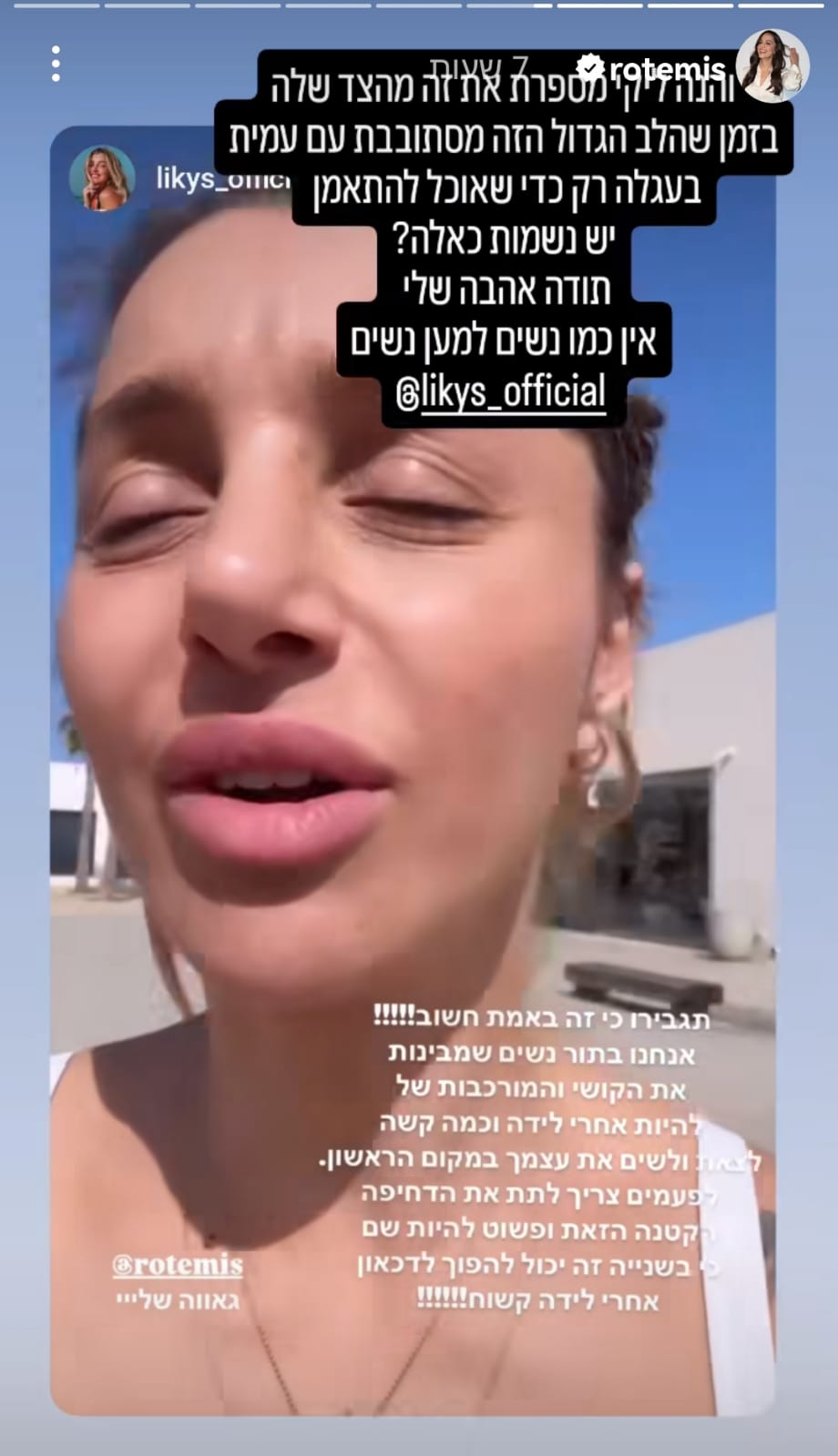 ישראל אכן לקחה למחרת אוטובוס עם בתה והגיעה לנמל ת"א להתאמן אצל "ליקיס" כשהמאמנת לוקחת, כפי שהבטיחה, את בתה לטיול כדי שהיא תוכל להתאמן. ליקי שיתפה בהמשך באינסטגרם שלה כמה חשוב לדעתה להושיט יד במצבים כאלה: "אי אפשר להסביר כמה זה חשוב לנשים אחרי לידה פשוט לתמוך ולהגיד להן 'בנות, צאו החוצה, אנחנו נעזור'. לפעמים צריך לתת את הדחיפה הקטנה הזאת ופשוט להיות שם כי בשנייה זה יכול להפוך לדיכאון אחרי לידה קשוח".