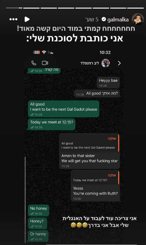 אחד מהן היא גל מלכה, כוכבת "המפקדת" ו"גוף שלישי", שראתה את גל גדות וקיבלה ממנה השראה. הבוקר היא החליטה להתאמן על האנגלית שלה וביקשה מהסוכנת שלה לעזור לה להפוך להיות גל גדות הבאה. בהתכתבות בין השתיים אומרת לה הסוכנת באנגלית "אנחנו נשיג לך את הפאקינג כוכב הזה".