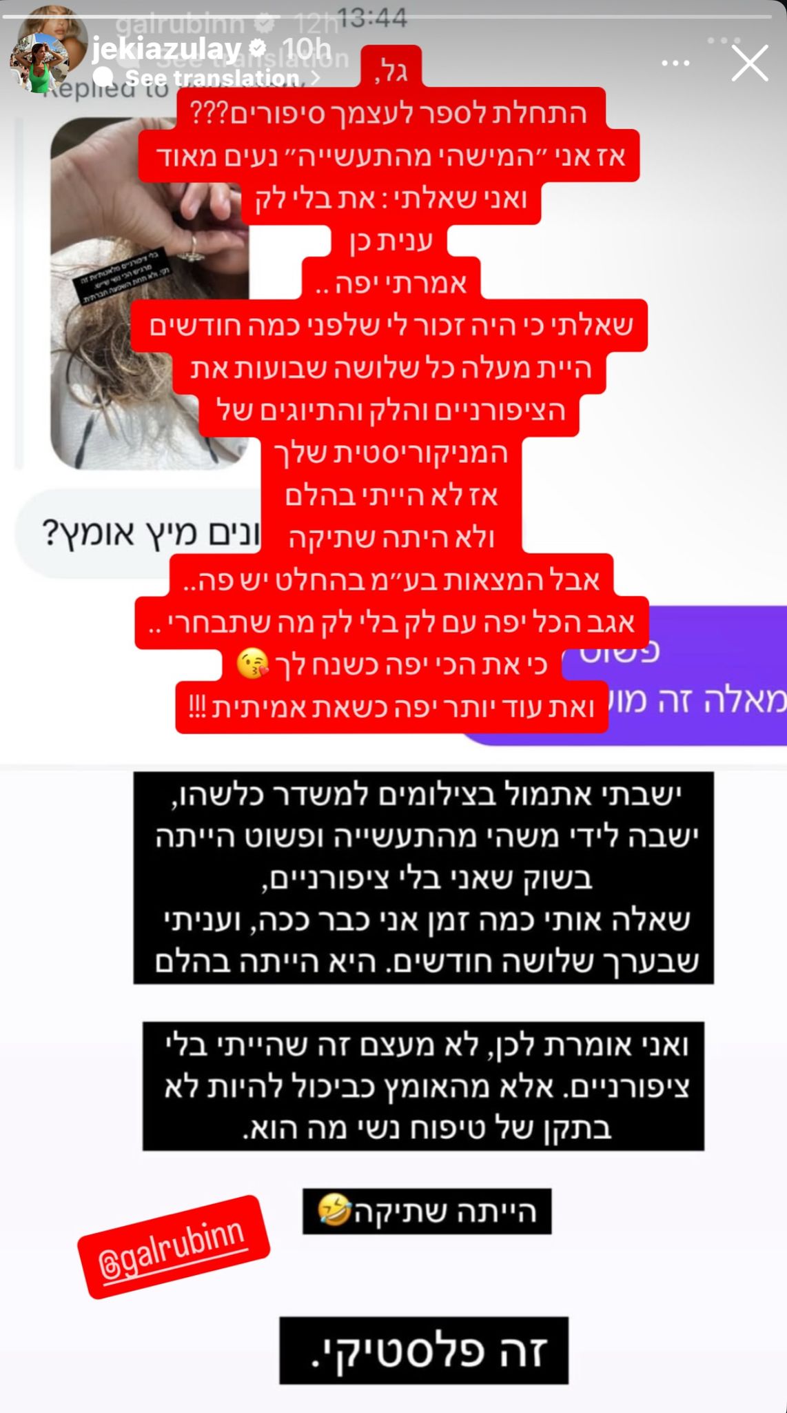 אך למעשה, מי שהתכוונה אליה בסטורי הייתה אזולאי וזאת החליטה להגיב הלילה בסטורי לדבריה של רובין: "גל, התחלת לספר לעצמך סיפורים??? אז אני ה'מישהי מהתעשייה', נעים מאוד. ואני שאלתי 'את בלי לק', ענית 'כן', אמרתי 'יפה'.. שאלתי כי היה זכור לי שלפני כמה חודשים היית מעלה כל שלושה שבועות את הציפורניים והלק והתיוגים של המניקוריסטית שלך".