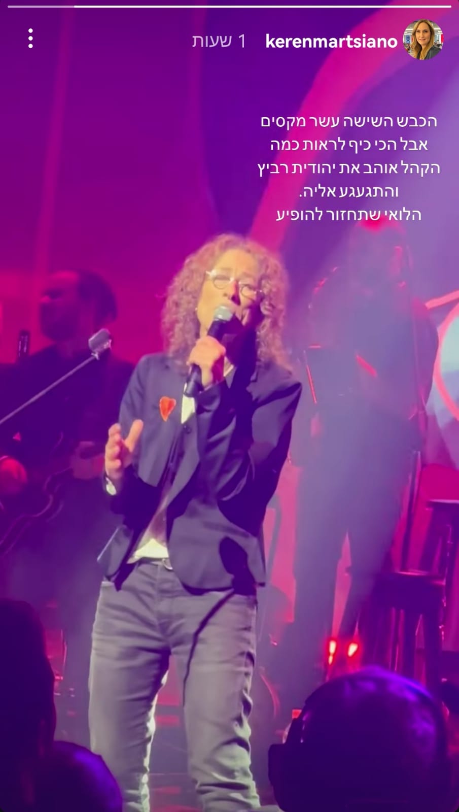 "הכבש השישה עשר מקסים אבל הכי כיף לראות כמה הקהל אוהב את יהודית רביץ והתגעגע אליה", כתבה מרציאנו באינסטגרם והוסיפה: "הלוואי שתחזור להופיע".