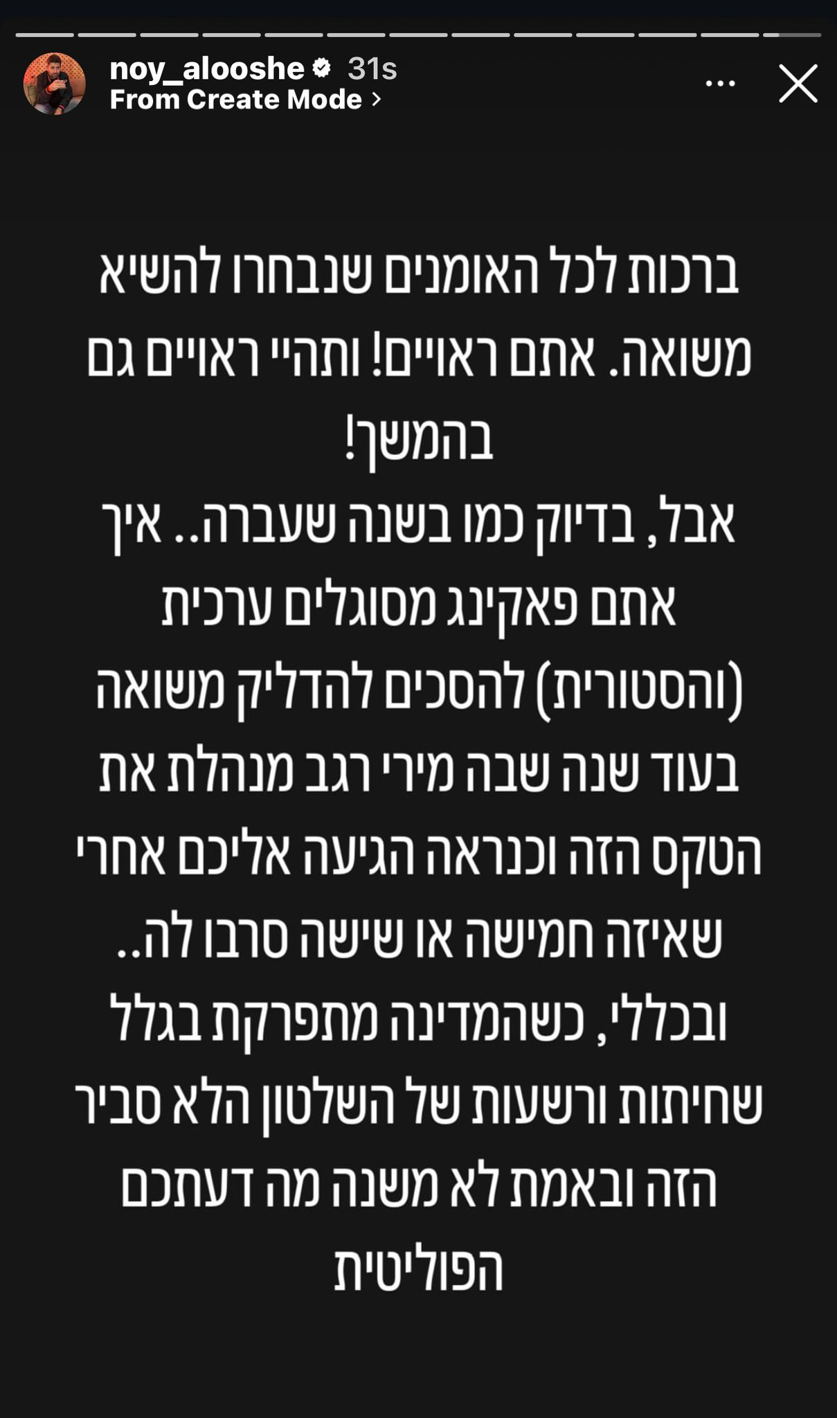 נוי אלוש, שדרן גלצ לשעבר, החליט לתקוף את מירי רגב ואת תחושות המוזיקאים שנבחרו להשיא משואה בידיעה שיש כאלו שסירבו לפני שהם קיבלו את ההצעה הנחשקת, כך כתב היום (שני) בסטורי בעמוד האינסטגרם שלו: "ברכות לכל האמנים שנבחרו להשיא משואה.