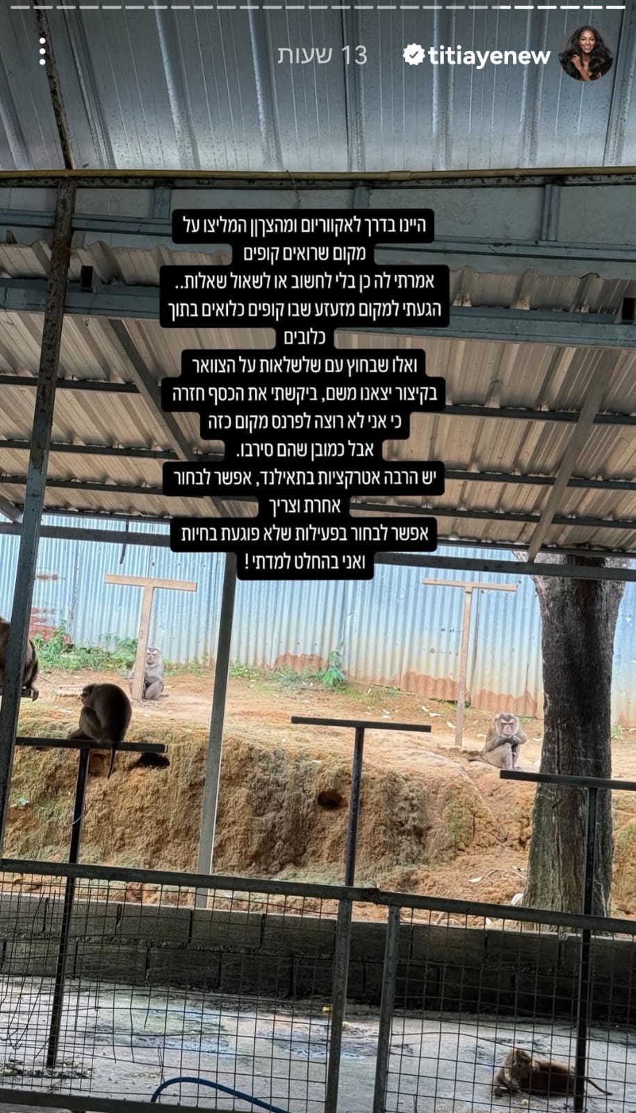 הדוגמנית, טיטי איינאו, נחשפה אמש ל"אטרקציה" מזעזעת במהלך חופשה ודיווחה בכאב לעוקביה: "קופים כלואים בתוך כלובים. ביקשתי את הכסף חזרה כי אני לא רוצה לפרנס מקום כזה"