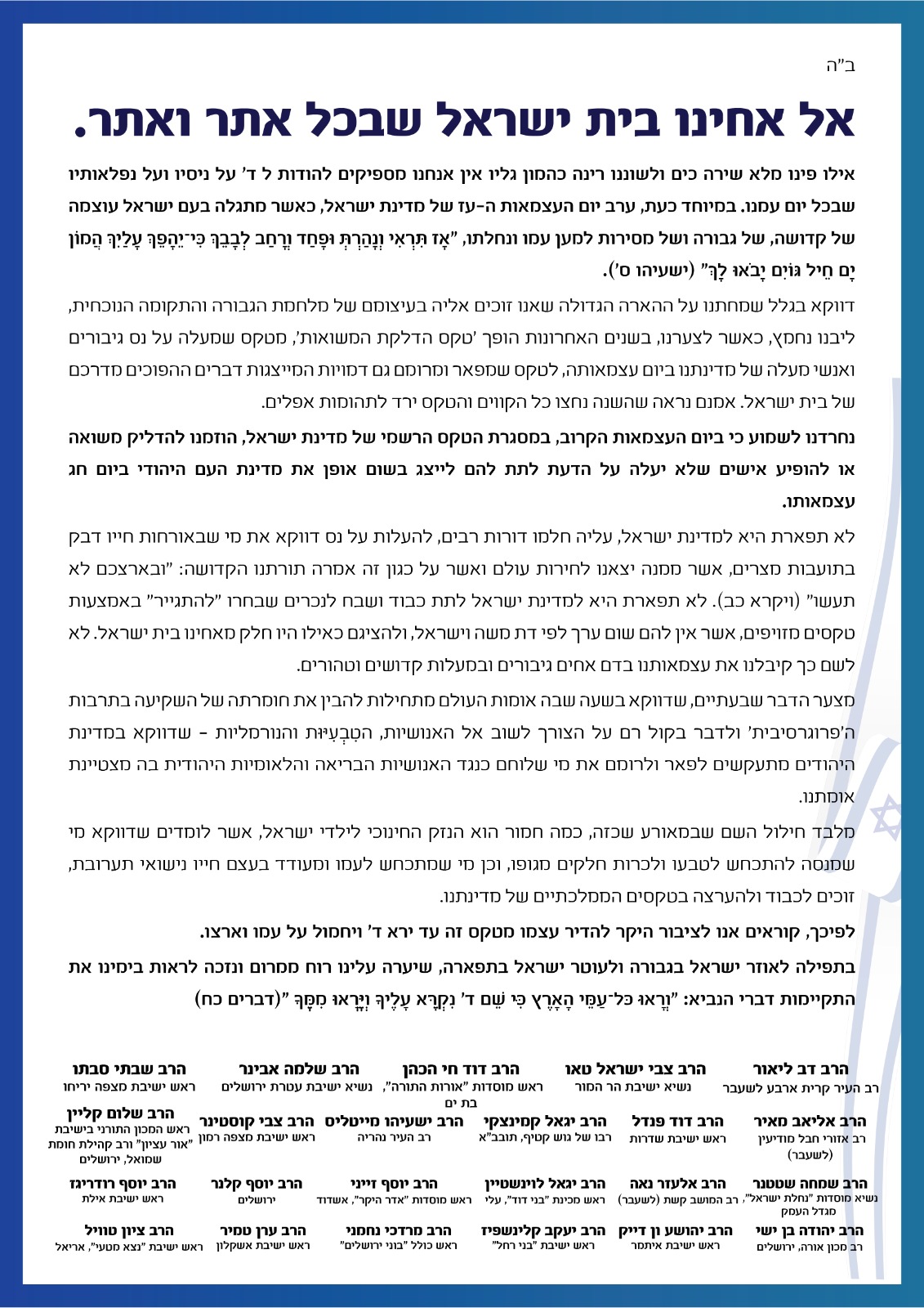 בתחילתו של המכתב נכתב: "נחרדנו לשמוע כי ביום הצמאות הקרוב, במסגרת הטקס הרשמי של מדינת ישראל, הוזמנו להופיע אישים שלא יעלה על הדעת לתת להם לייצג בשום אופן את מדינת העם היהודי ביום חג עצמאותו". עוד הוסיפו: "ליבנו נחמץ כאשר לצערנו, בשנים האחרונות הופך טקס הדלקת המשואות מטקס שמעלה על נס גיבורים ואנשי מעלה של מדינתנו ביום עצמאותה".