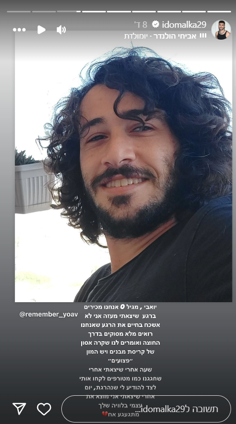 בסטורי שהעלה היום (רביעי) לחשבונו כתב מלכה: "יואבי, מגיל אפס אנחנו מכירים. ברגע שיצאתי מעזה אני לא אשכח בחיים את הרגע שאנחנו רואים מלא מסוקים בדרך החוצה ואומרים לנו שקרה אסון של קריסת מבנים ויש המון 'פצועים'. שעה אחרי שיצאתי אחרי שחגגנו כמו מטורפים לקחו אותי לצד להודיע לי שנהרגת, יום אחרי שיצאתי אני מוצא את עצמי בלוויה שלך. מתגעגע אח".