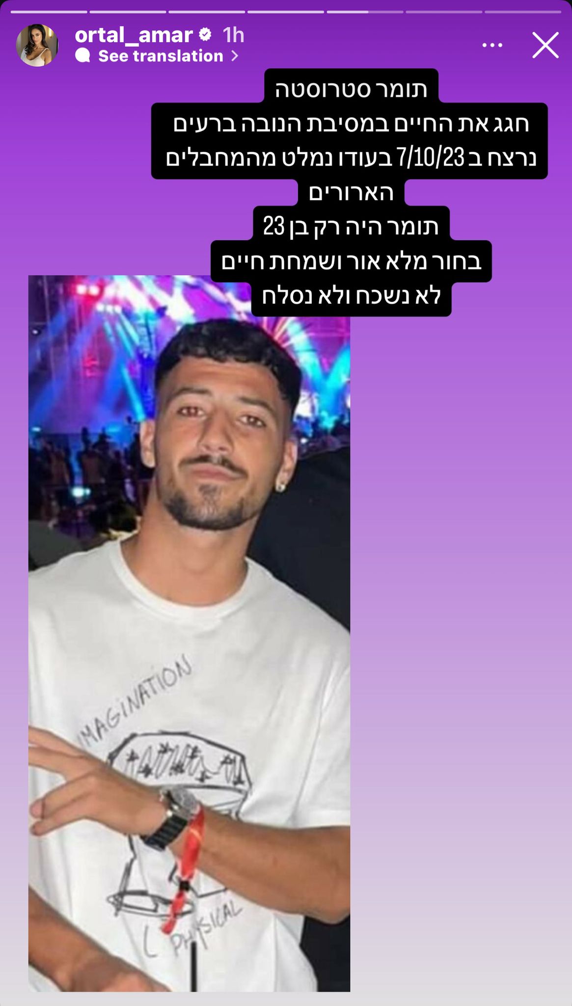 לאחר מכן, החליטה עמר לשתף גם את סיפורו של תומר סטרוסטה הי"ד, שנרצח בטבח ה-7/10, במסיבה ברעים ולהעניק לו כבוד בסטורי נוסף שהעלתה: "תומר סטרוסטה, חגג את החיים במסיבת הנובה ברעים, נרצח ב־7/10/23 בעודו נמלט מהמחבלים הארורים. תומר היה רק בן 23, בחור מלא אור ושמחת חיים. לא נשכח ולא נסלח".