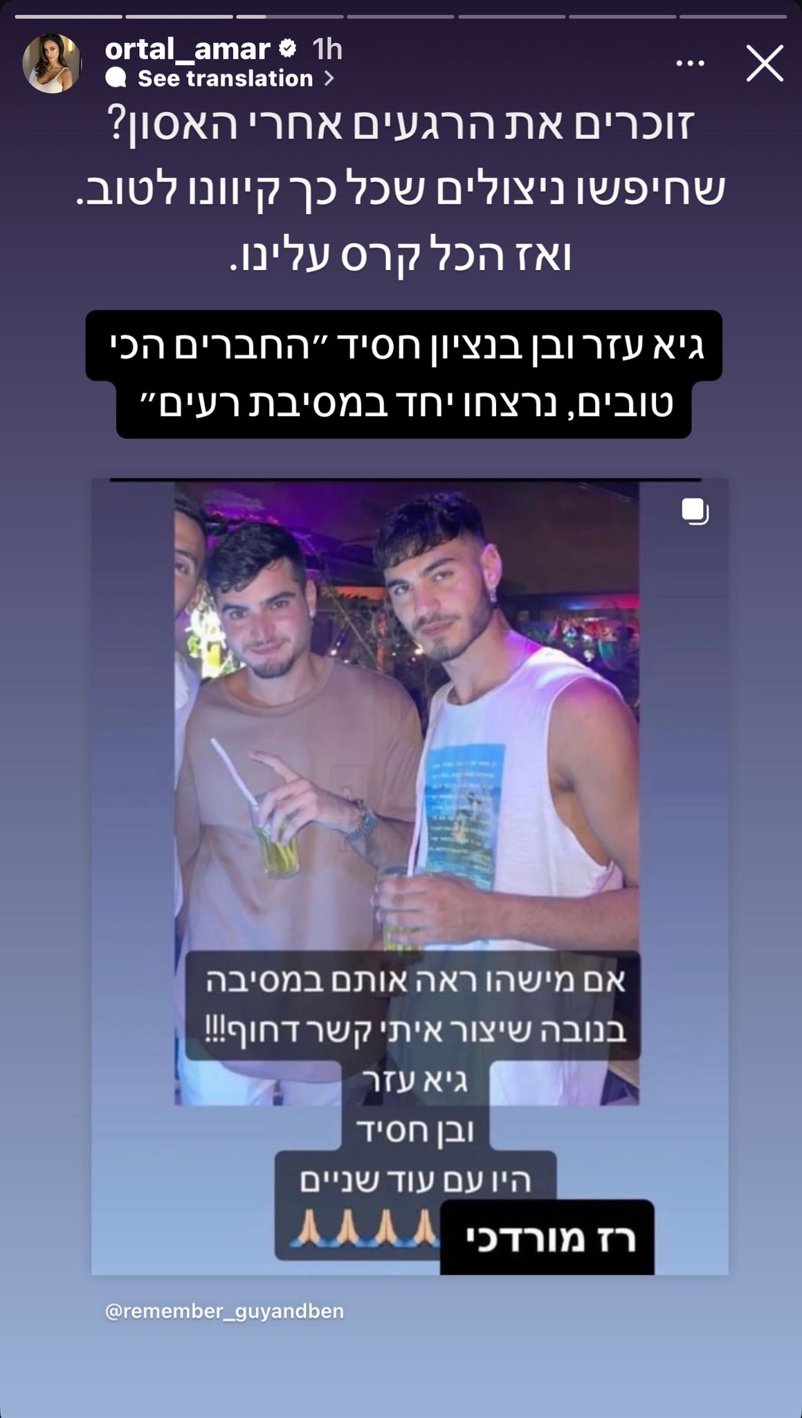 במחווה בסטורי נוסף, בחרה עמר לשתף את סיפורם של גיא עזר ובן בנציון הי"ד עם תחושות הקרובים, בצל חוסר הוודאות שנוצר רגעים אחרי הטבח, בזמן החיפוש אחריהם: "זוכרים את הרגעים אחרי האסון? שחיפשו ניצולים שכל כך קיווינו לטוב. ואז הכל קרס עלינו. גיא עזר ובן בנציון חסיד 'החברים הכי טובים, נרצחו יחד במסיבת רעים'".