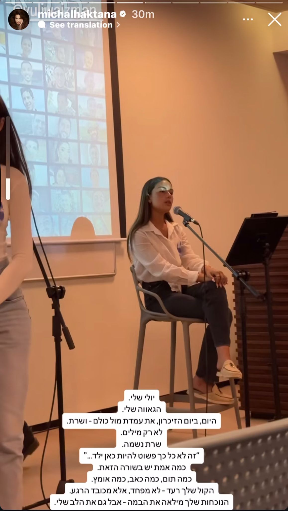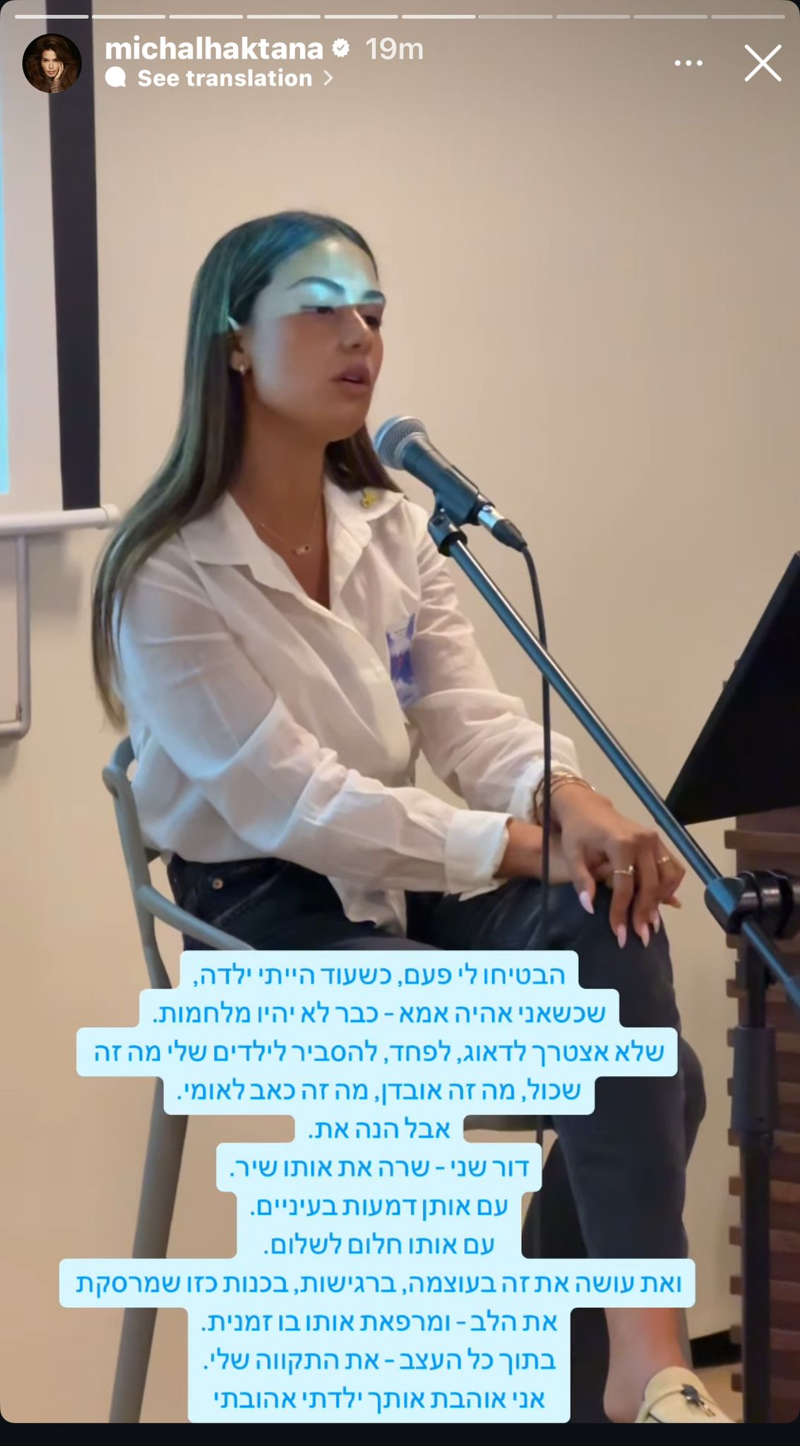לאחר מכן, העלתה סטורי נוסף בו כתבה עוד על תחושותיה: "הבטיחו לי פעם, כשעוד הייתי ילדה, שכשאני אהיה אמא – כבר לא יהיו מלחמות. שלא אצטרך לדאוג, לפחד, להסביר לילדים שלי מה זה שכול, מה זה אובדן, מה זה כאב לאומי. אבל הנה את. דור שני – שרה את אותו שיר, עם אותן דמעות בעיניים. עם אותו חלום לשלום. ואת עושה את זה בעוצמה, ברגישות, בכנות כזו שמרסקת את הלב – ומרפאת אותו בו זמנית. בתוך כל העצב, את התקווה שלי. אני אוהבת אותך ילדתי אהובתי".