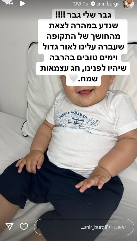 בסטורי שפרסם אמש (רביעי) בחשבון האינסטגרם שלו, הציג שניר בורגיל את תמונתו של בנו אלארי כשפניו מוסתרות. לצד זאת, כתב כוכב הריאליטי: "גבר שלי גבר, שנדע במהרה לצאת מהחושך של התקופה שעברה עלינו לאור גדול וימים טובים בהרבה שיהיו לפנינו. חג עצמאות שמח".