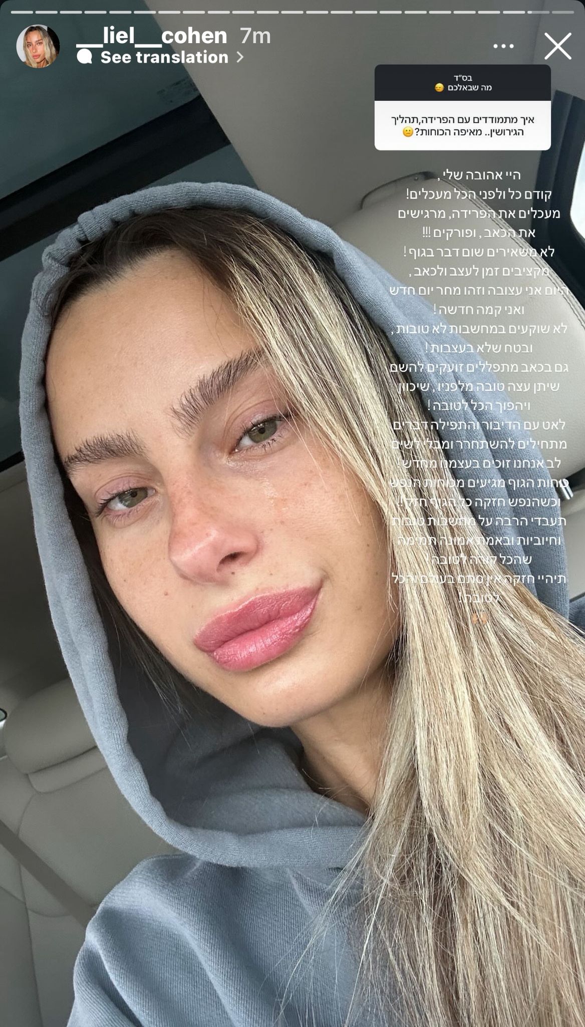 כהן, ברצף סטוריז שאלות-תשובות שהעלתה היום (ראשון) לעמוד האינסטגרם שלה, היא מתייחסת לשאלת העוקבת ששאלה אותה: "איך מתמודדים עם הפרידה, תהליך הגירושין, מאיפה הכוחות?" והשיבה: "היי אהובה שלי, קודם כל ולפני הכל מעכלים!. מעכלים את הפרידה, מרגישים את הכאב, ופורקים!, לא משאירים את זה דבר בגוף!, נותנים מקום לעצב ולכאב. בוכים כשצריך ומרשים לעצמנו להרגיש".