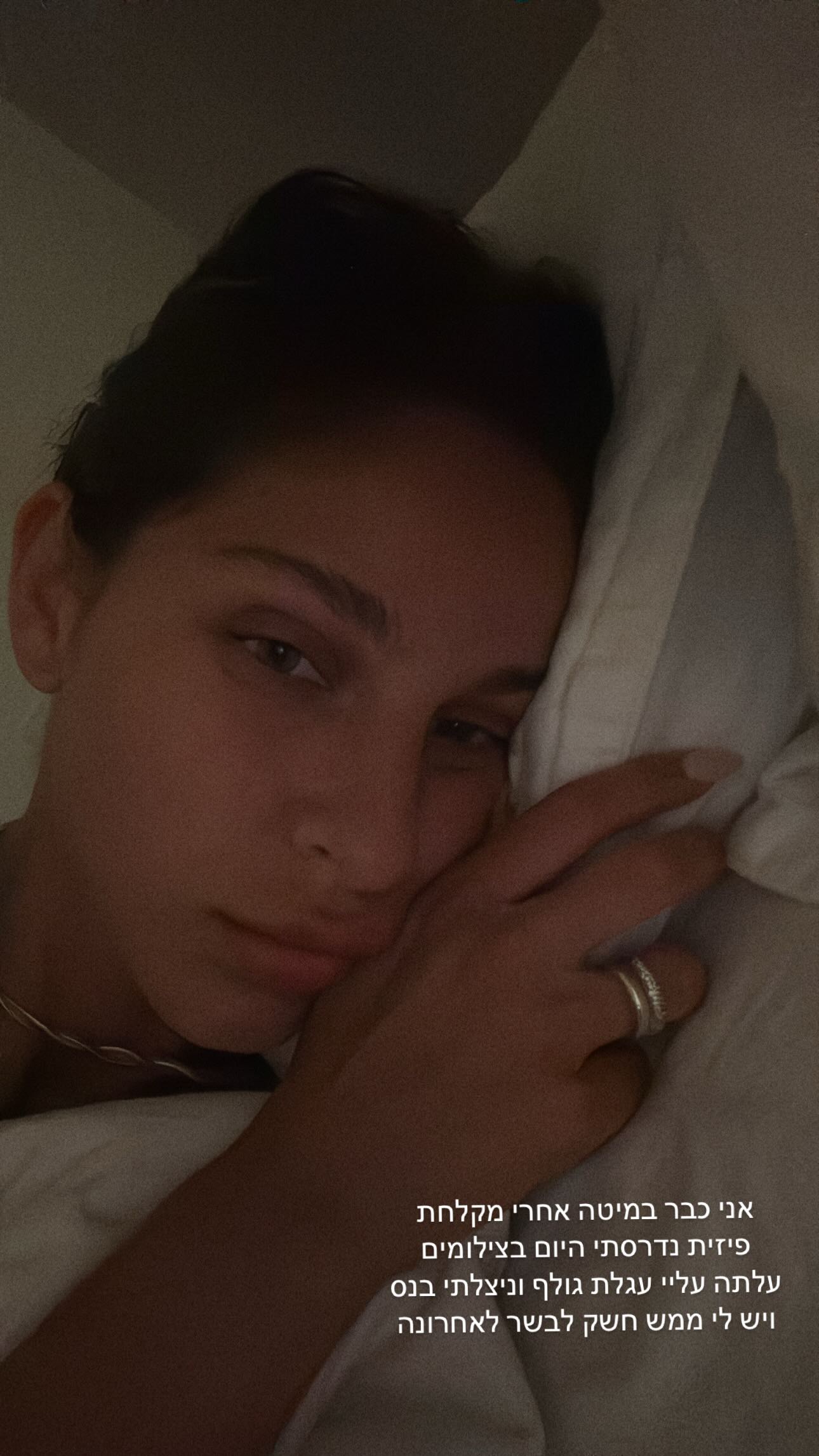 לצד התמונה שפרסמה בחשבון האינסטגרם שלה, בה היא נראית תשושה מהיום שעברה, כתבה אן אברהמי: "אני כבר במיטה אחרי מקלחת. פיזית נדרסתי היום בצילומים. עלתה עליי עגלת גולף וניצלתי בנס".