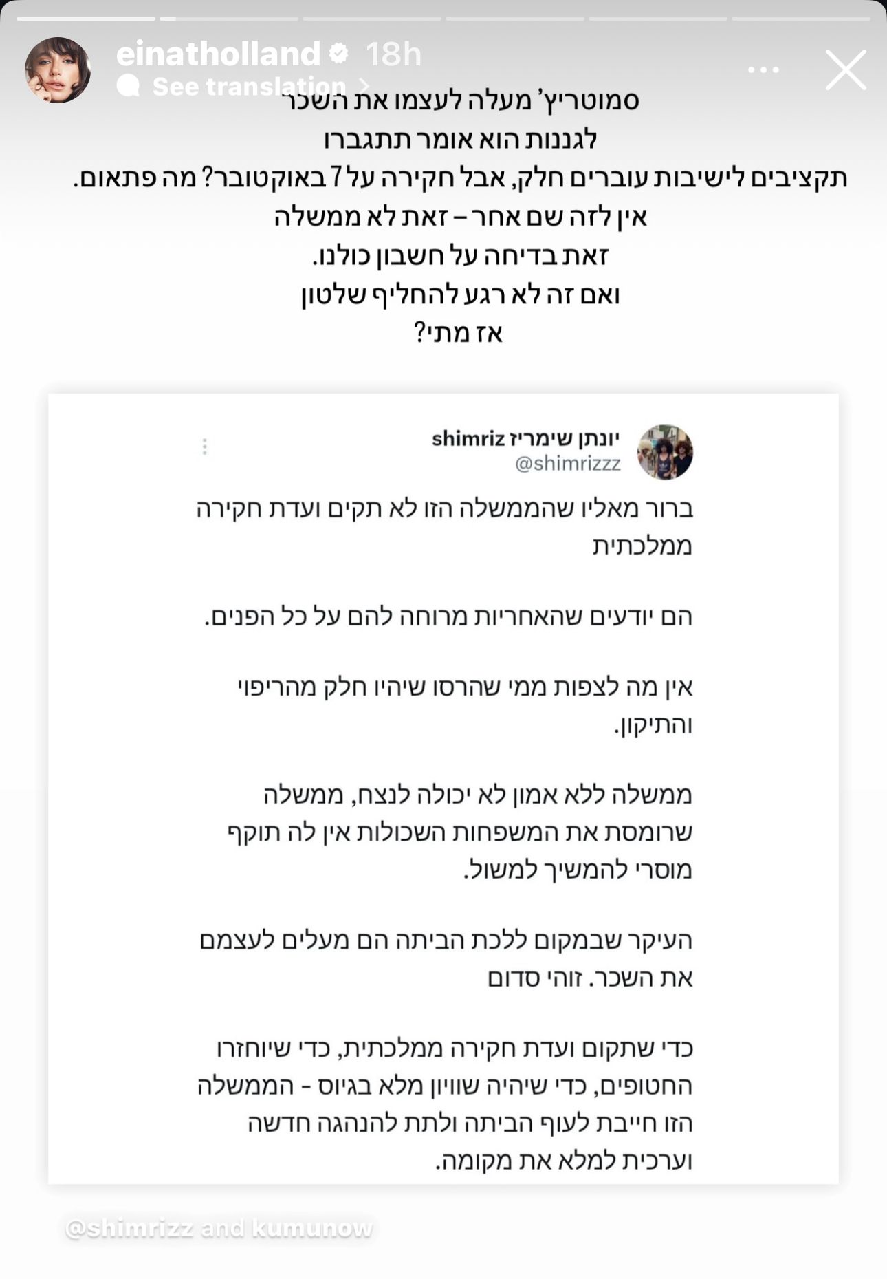 אך כמובן לא זאת הכל. אתמול, היא העלתה סטורי לעמוד האינסטגרם שלה, בו בחרה לתקוף את שר האוצר, כך כתבה: ""סמוטריץ’ מעלה לעצמו את השכר, לגננות הוא אומר תתגברו. תקציבים לישיבות עוברים חלק, אבל חקירה על 7 באוקטובר? מה פתאום. אין לזה שם אחר – זאת לא ממשלה. זאת בדיחה על חשבון כולנו. ואם זה לא רגע להחליף שלטון, אז מתי?".