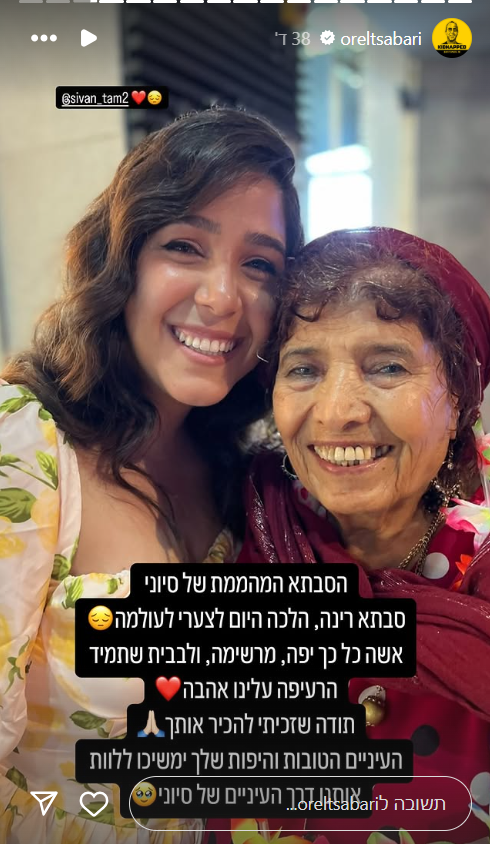 צברי כתב כי הסבתא של סיון תם, אשתו, הלכה היום (חמישי) לעולמה בשיבה טובה. צברי שיתף באינסטגרם תמונה של סיון עם סבתא רינה והוסיף: "הסבתא המהממת של סיוני, סבתא רינה, הלכה היום לצערי לעולמה. אישה כל כך יפה, מרשימה ולבבית שתמיד הרעיפה עלינו אהבה. תודה שזכיתי להכיר אותך. העיניים הטובות והעיפות שלך ימשיכו ללוות אותנו דרך העיניים של סיוני".