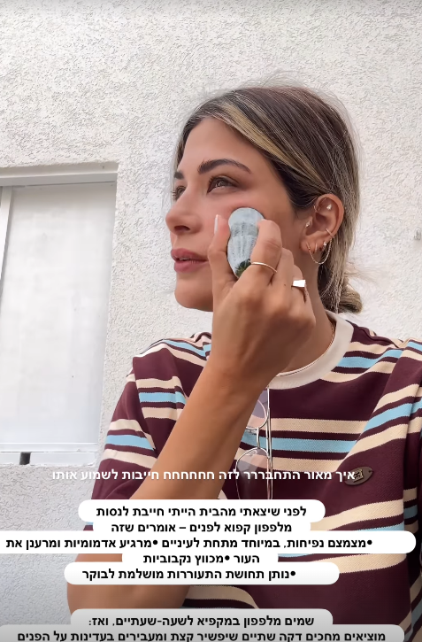 המשפיענית ואשתו של הכדורגלן לשעבר מאור בוזגלו, מירן בוזגלו, שיתפה ביממה האחרונה את עשרות אלפי העוקבים שלה בטיפ יופי יוצא דופן: מלפפון קפוא לפנים. "לפני שיצאתי מהבית הייתי חייבת לנסות את זה", כתבה בסטורי, והסבירה בהתלהבות: "אומרים שזה מצמצם נפיחות, במיוחד מתחת לעיניים, מרגיע אדמומיות, מרענן את העור, מכווץ נקבוביות ונותן תחושת התעוררות מושלמת לבוקר".
