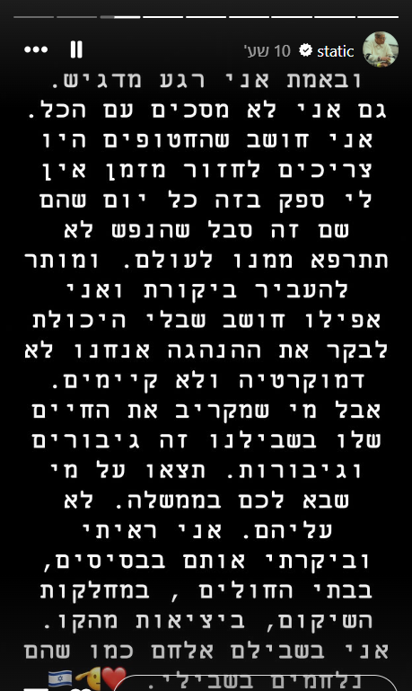 סטטיק גם כתב: ''באמת שאני לא אדם עם דעות קיצוניות לא לכאן ולא לכאן. סך הכל יהודי ישראלי שרוצה לחיות בארץ שלו בשלום בשקט. לגדל פה ילדים בנחת ולעשות שמח לאנשים שזה מה שאני יודע לעשות. רשם לי איזה בחור פה משהו שאני אעלה ולא רוצה לפגוע באף אחד אצנזר את שמו''.