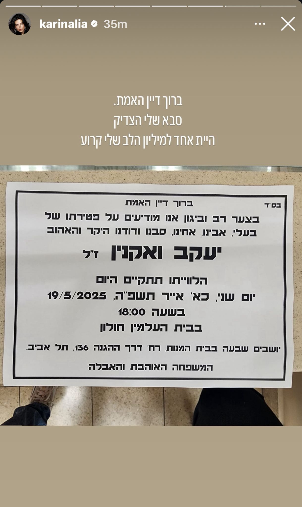 כוכבת "רוקדים עם כוכבים", קארין עליה, נפרדת מהקרוב אליה ביותר בסטוריז שהעלתה לעמוד האינסטגרם שלה