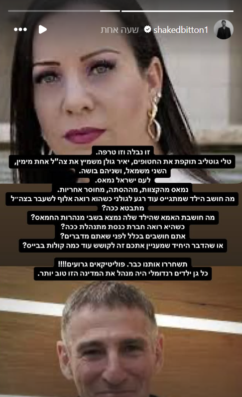 בסטורי שפרסם הבוקר כתב ביטון לעוקביו ותקף בכעס את גוטליב וגולן: "זו נבלה וזו טרפה. טלי גוטליב תוקפת את החטופים, יאיר גולן משמיץ את צה"ל. אחת מימין, השני משמאל ושניהם בושה. לעם ישראל נמאס. נמאס מהקצוות, מההסתה, מחוסר אחריות. מה חושב הילד שמתגייס עוד רגע לגולני כשהוא רואה אלוף לשעבר בצה"ל מתבטא ככה? מה חושבת האמא שהילד שלה נמצא בשבי מנהרות החמאס? כשהיא רואה חברת כנסת מתנהלת ככה? אתם חושבים בכלל לפני שאתם מדברים? או שהדבר היחיד שמעניין אתכם זה לקושש עוד כמה קולות בבייס? תשחררו אותנו כבר פוליטיקאים גרועים! כל גן ילדים רנדומלי היה מנהל את המדינה הזו יותר טוב".