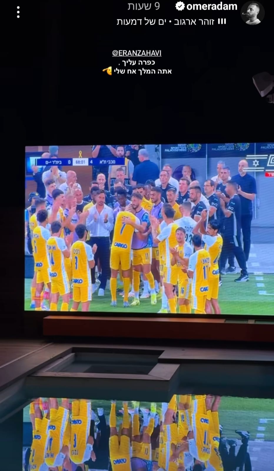 גם הזמר עומר אדם ישב אתמול בבית וצפה גם הוא במשחק המכריע והתרגש ביחד עם כולם. בסיום המשחק העלה הזמר צילום של מסך הטלוויזיה, ברגע הפרידה של הכדורגלן מחבריו לקבוצה וכתב: "כפרה עלייך, אתה המלך שלי".