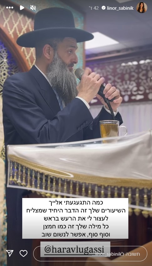 לינור סבניק העלתה לאינסטגרם סרטון של הרב ישראל ניסים לוגסי. כזכור, בשנת 2017 נצפה הרב ישראל ניסים לוגסי עם צמד כוכבי "האח הגדול" מעיין אשכנזי ואביחי אוחנה. על פי הפרסום של אתר מאקו, הרבה ניסים לוגסי הכיר את אשכנזי בטרם הפכה לשם דבר בתעשייה ובמסגרת תהליך הקרבה שלה לדת, היא נהגה להשתתף בשיעורי התורה שהעביר.