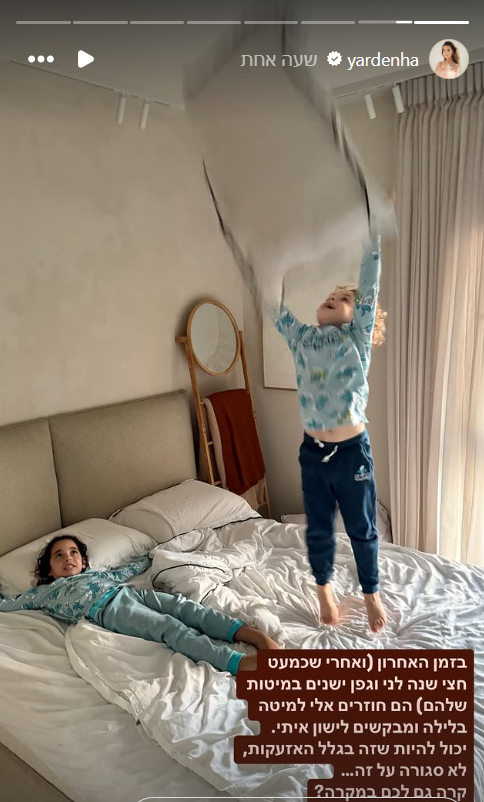 ירדן הראל, מגישת תוכנית הבוקר "פותחים יום" ברשת 13, משתפת את העוקבים בקשיים שהתעוררו לאחרונה בהרגלי השינה של ילדיה התאומים.