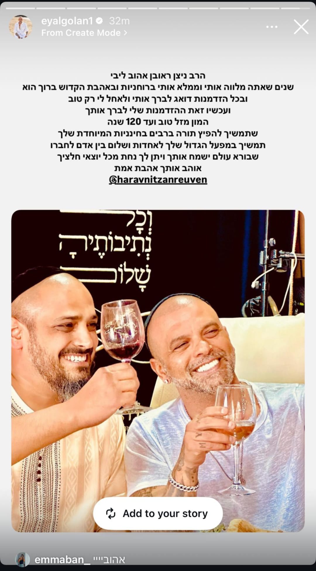 בברכה שהעלה הזמר הוא כתב: "הרב ניצן ראובן אהוב ליבי, שנים שאתה מלווה אותי וממלא אותי ברוחניות ובאהבת הקדוש ברוך הוא, ובכל הזדמנות אתה דואג לברך אותי ולאחל לי רק טוב - ועכשיו זו ההזדמנות שלי לברך אותך".