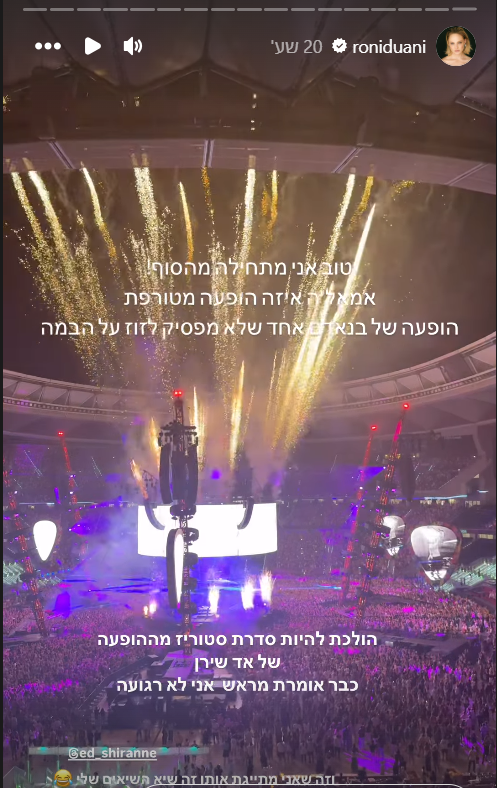 רוני שיתפה את עשרות אלפי העוקבים שלה בסדרת סטוריז מתוך ההופעה, וכתבה עד כמה נהנתה והתרגשה לחוות אותו.