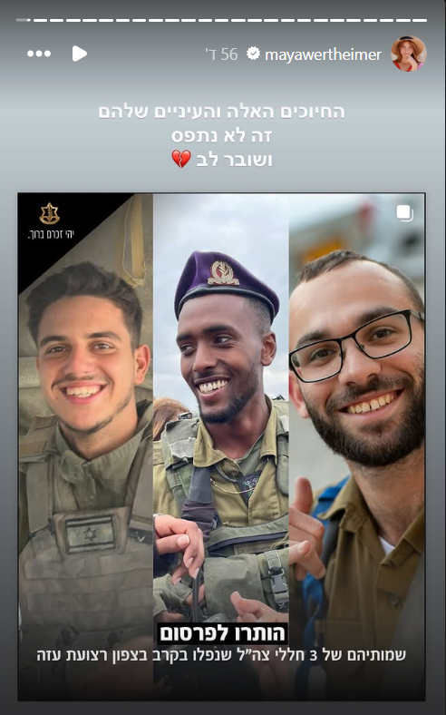 השחקנית מאיה ורטהיימר התייחסה לחדשות הקשות, צירפה את תמונות החיילים וכתבה בסטורי: "החיוכים האלה והעיניים שלהם זה לא נתפס ושובר לב".