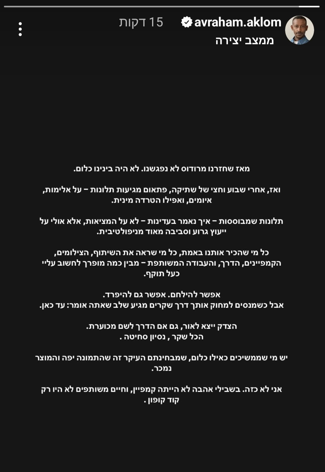 הבוקר (שלישי) הוא שובר שתיקה וחושף את הצד שלו בנושא. בסטורי שהעלה לאינסטגרם שלו כתב: "מאז שחזרנו מרודוס לא נפגשנו. לא היה בינינו כלום. ואז, אחרי שבוע וחצי של שתיקה, פתאום מגיעות תלונות – על אלימות, איומים, ואפילו הטרדה מינית. תלונות שבבסיסן – איך נאמר בעדינות – לא על המציאות, אלא אולי על ייעוץ גרוע וסביבה מאוד מניפולטיבית. כל מי שהכיר אותנו באמת, כל מי שראה את השיתוף, הצילומים, הקמפיינים, הדרך, והעבודה המשותפת – מבין כמה מופרך לחשוב עליי כעל תוקף".