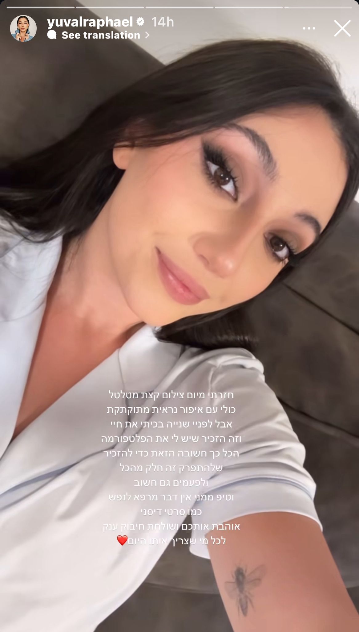 רפאל לא חשפה מה הסיבה לכך, אך הוסיפה ושלחה מסר אופטימי: "וזה הזכיר לי שיש את הפלטפורמה הכל-כך חשובה הזאת, כדי להזכיר שלהתפרק זה חלק מהכל ולפעמים גם חשוב". לסיום נתנה טיפ לעוקבים: "וטיפ ממני - אין דבר מרפא לנפש כמו סרטי דיסני. אוהבת אותכם ושלחת חיבוק ענק לכל מי שצריך את זה היום".