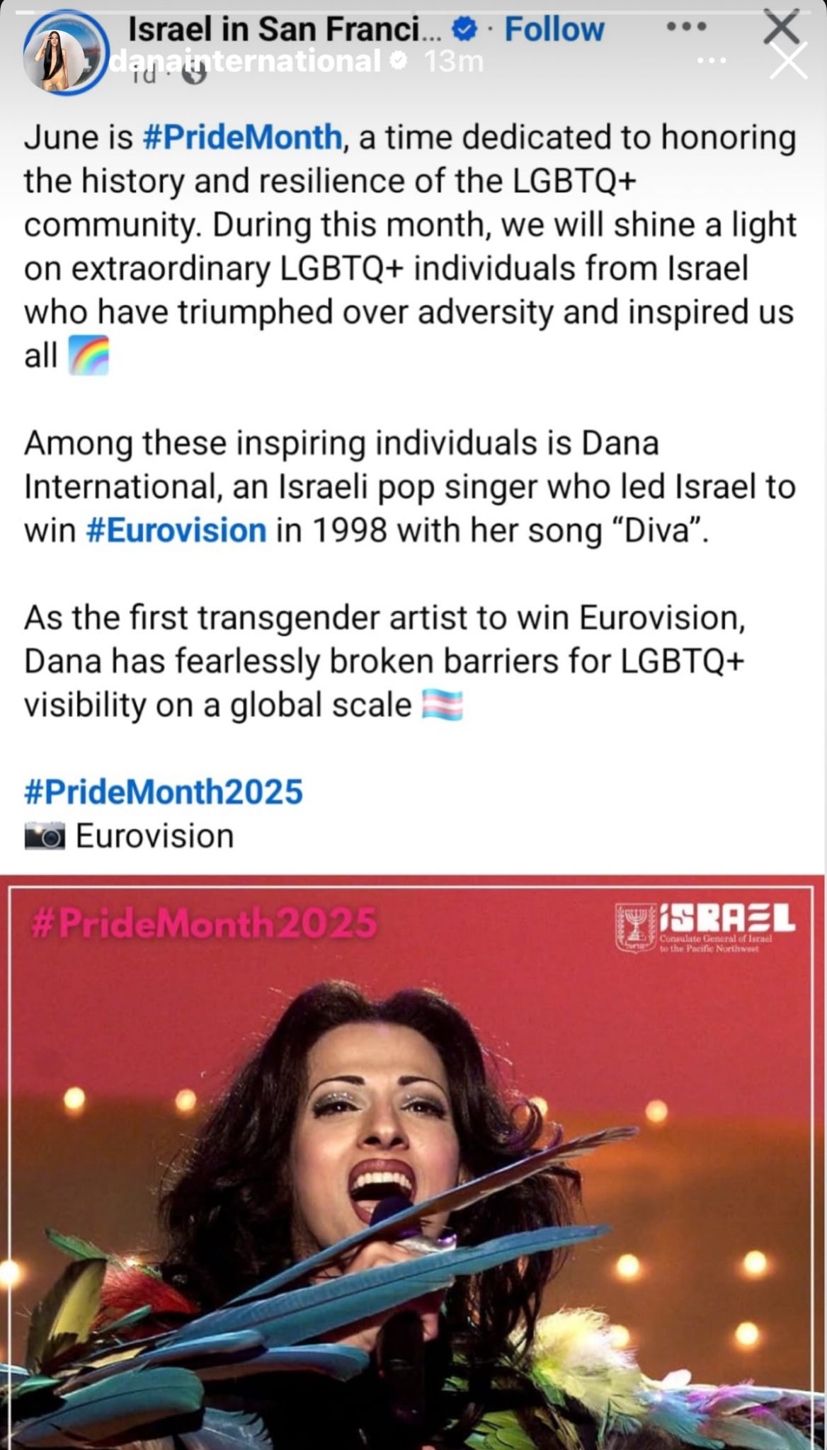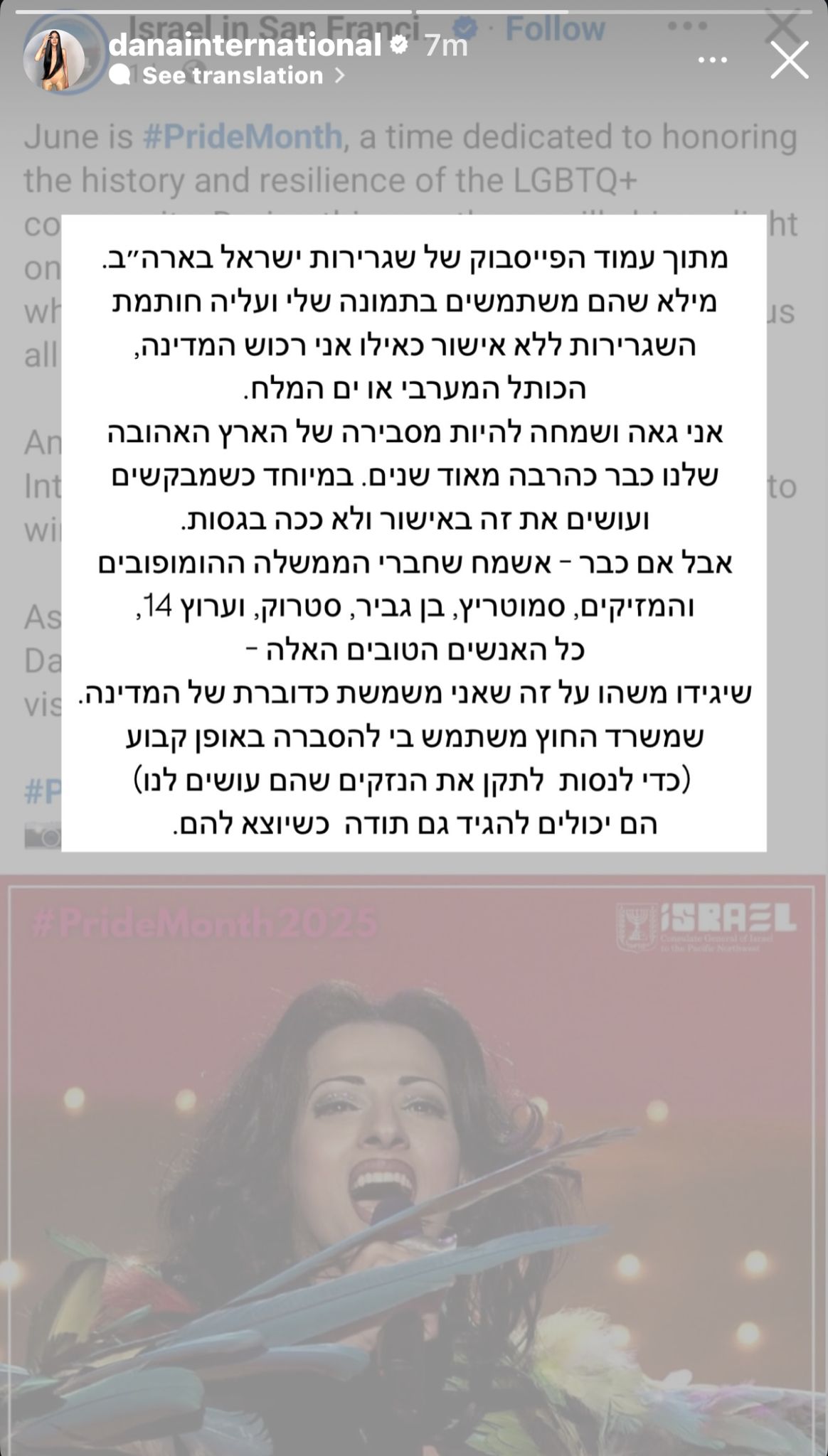 אני גאה ושמחה להיות מסבירה של הארץ האהובה שלנו כבר הרבה מאוד שנים. במיוחד כמבקשים ועושים את זה באישור ולא ככה בגסות. אבל אם כבר, אשמח שחברי הממשלה ההומופובים והמזיקים, סמוטריץ’, בן גביר, סטרוק, וערוץ 14, כל האנשים הטובים האלה, שיגידו משהו על זה שאני משמשת כדוברת של המדינה. שמשרד החוץ משתמש בי להסברה באופן קבוע (כדי לנסות לתקן את הנזקים שהם עושים לנו) הם יכולים להגיד גם תודה כשיוצא להם"; אלו רצף הסטוריז שפרסמה.