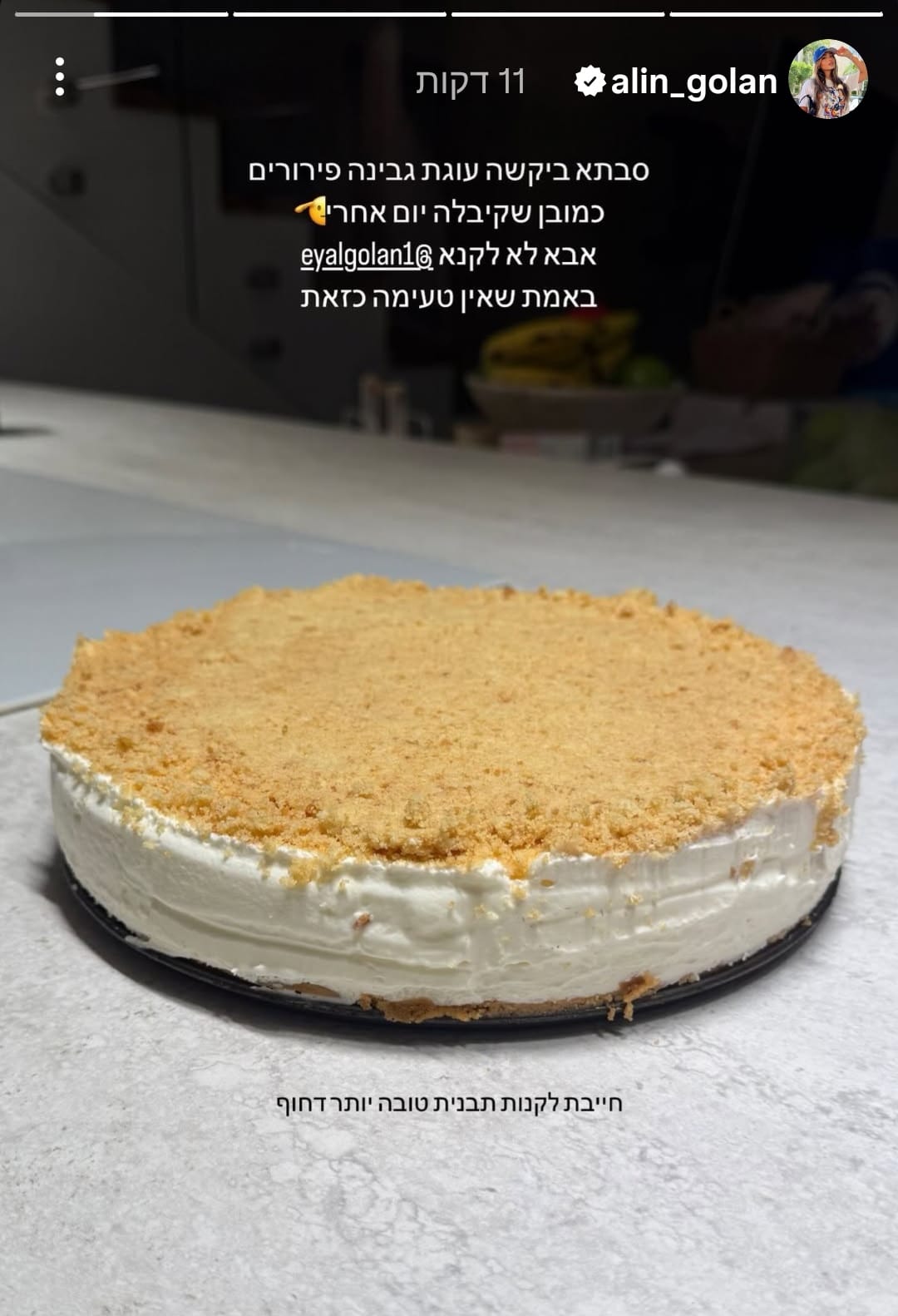 "סבתא ביקשה עוגת גבינה פירורים. כמובן שקיבלה יום אחרי", כתבה גולן באינסטגרם בצירוף אימוג'י מצדיע ותיעוד של עוגת הגבינה הקרה שהכינה. הכוכבת הצעירה, שכזכור לנו, אוהבת מאוד לאפות במטבח, שלחה באותה הזדמנות מסר לאביה, הזמר אייל גולן, וביקשה: "אבא לא לקנא".