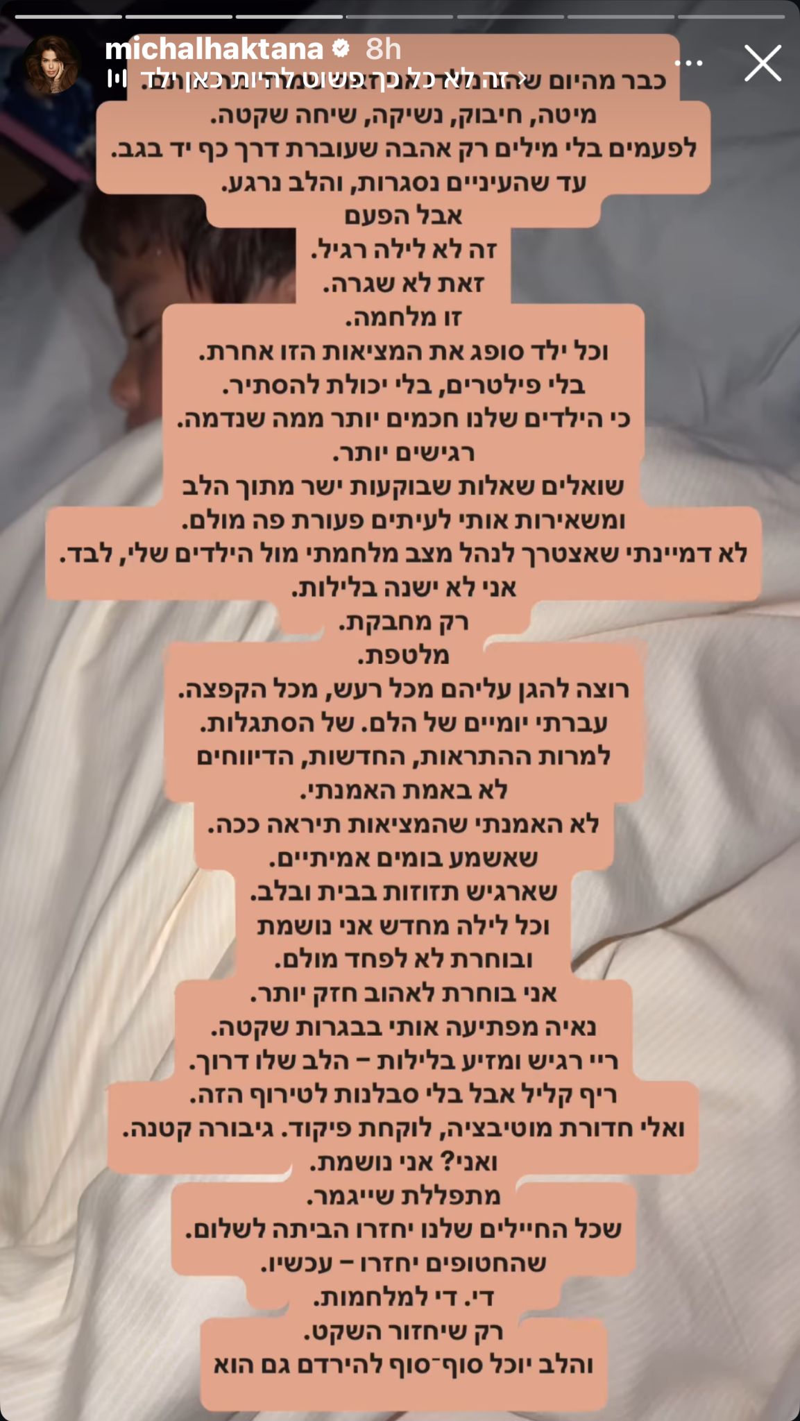 עוד הוסיפה ויצמן: "בלי פילטרים, בלי יכולת להסביר. שואלים שאלות שבוקעות ישר מתוך הלב ומשאירות אותי לעיתים פעורת פה מולו. רוצה להגן מכל רעש. לא באמת האמנתי. כל לילה מחדש אני נושמת ובוחרת לא לפחד מולו", והתייחסה לרגשותיה העמוקים ביותר: "אני בוחרת לאהוב חזק יותר"; צפו בסטורי המלא.