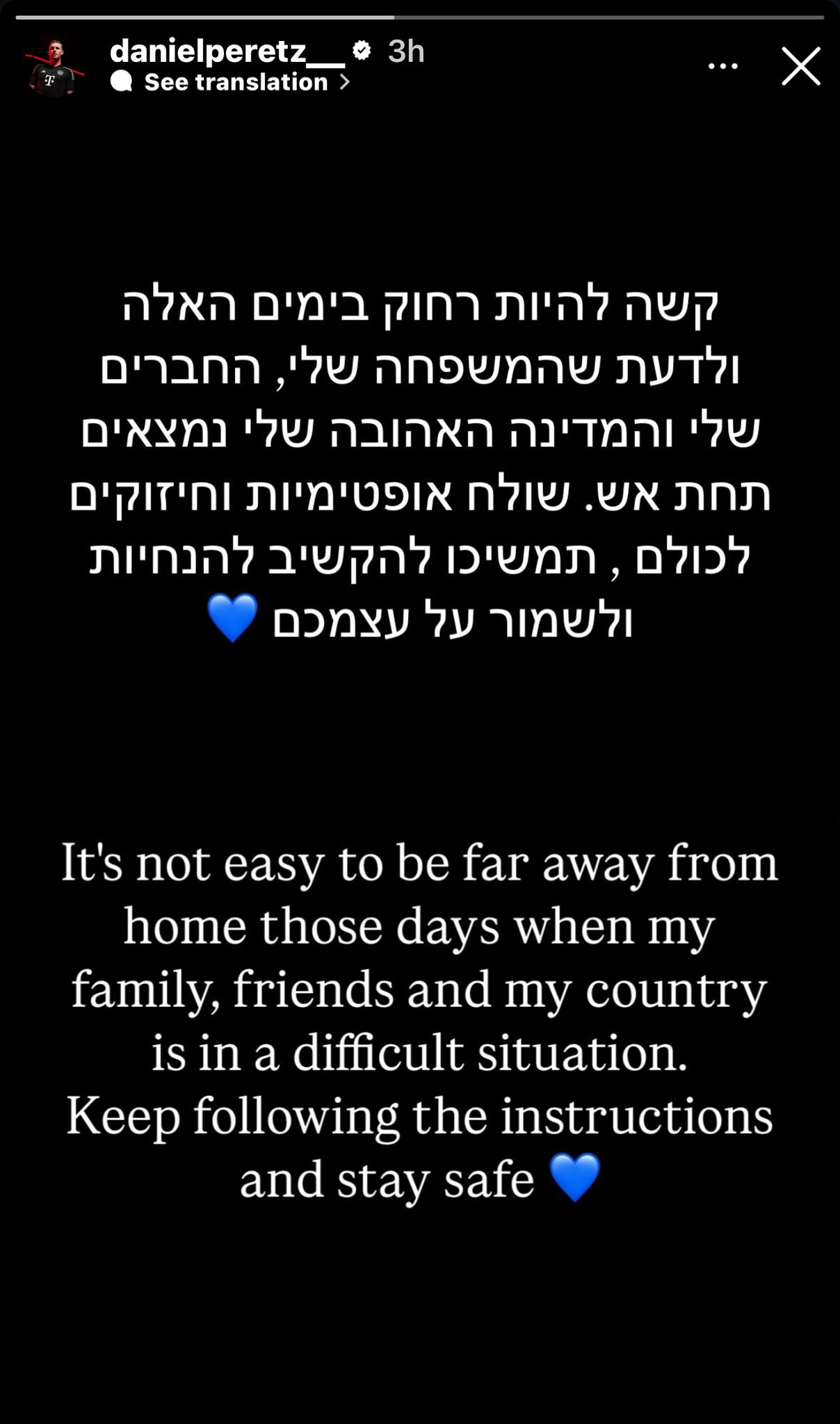 האם יהיו שינויים? פרץ העלה הבוקר (רביעי) סטורי לעמוד האינסטגרם שלו, בו התייחס לתחושותיו בצל מלחמת ישראל - איראן, כך שיתף: "קשה להיות רחוק בימים האלה ולדעת שהמשפחה שלי, החברים שלי והמדינה האהובה שלי נמצאים תחת אש. שולח אופטימיות וחיזוקים לכולם, תמשיכו להקשיב להנחיות ולשמור על עצמכם".