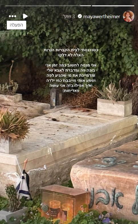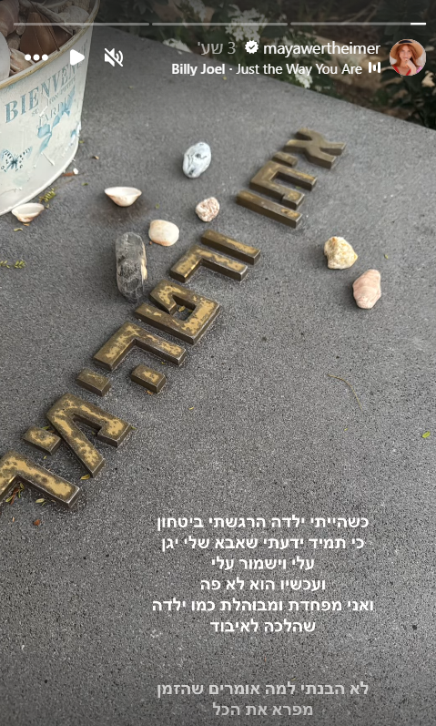 בסטורי שהעלתה אמש (מוצ"ש) כתבה מאיה ורטהיימר: "כשהייתי ילדה הרגשתי ביטחון כי תמיד ידעתי שאבא שלי יגן עלי וישמור עלי ועכשיו הוא לא פה ואני מפחדת ומבוהלת כמו ילדה שהלכה לאיבוד. לא הבנתי למה אומרים שהזמן מרפא את הכל".