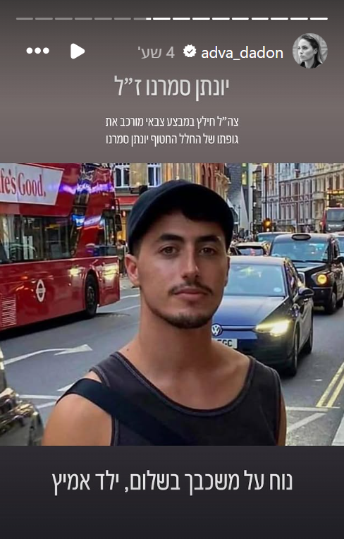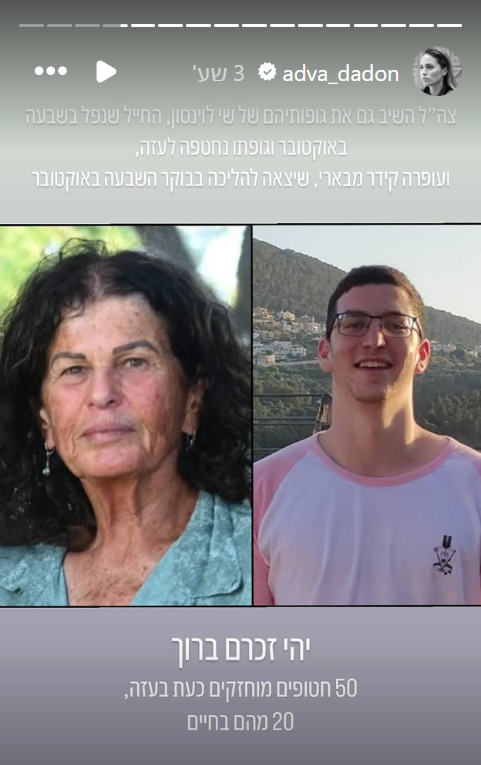 עוד הוסיפה וכתבה אדוה דדון: "צה"ל השיב גם את גופותיהם של שי לוינסון, החייל שנפל בשבעה באוקטובר וגופתו נחטפה לעזה. ועופרה קידר מבארי שיצאה להליכה בבוקר השבעה באוקטובר. יהי זכרם ברוך".