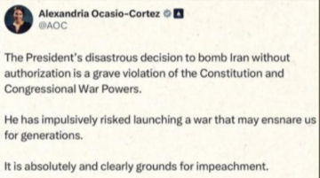 גרנדה-שכיכבה בלהיט "מרשעת"-שיתפה בסטורי פוסט של חברת הקונגרס הדמוקרטית אלכסנדרה אוקסיו קורטז, בו כתבה: "ההחלטה ההרסנית של הנשיא להפציץ את איראן ללא אישור היא הפרה חמורה של החוקה ושל סמכויות המלחמה של הקונגרס. באופן אימפולסיבי הוא סיכן אותנו ופתח במלחמה שיכולה לסכן אותנו לדורות. זו עילה מוחלטת להדחתו".