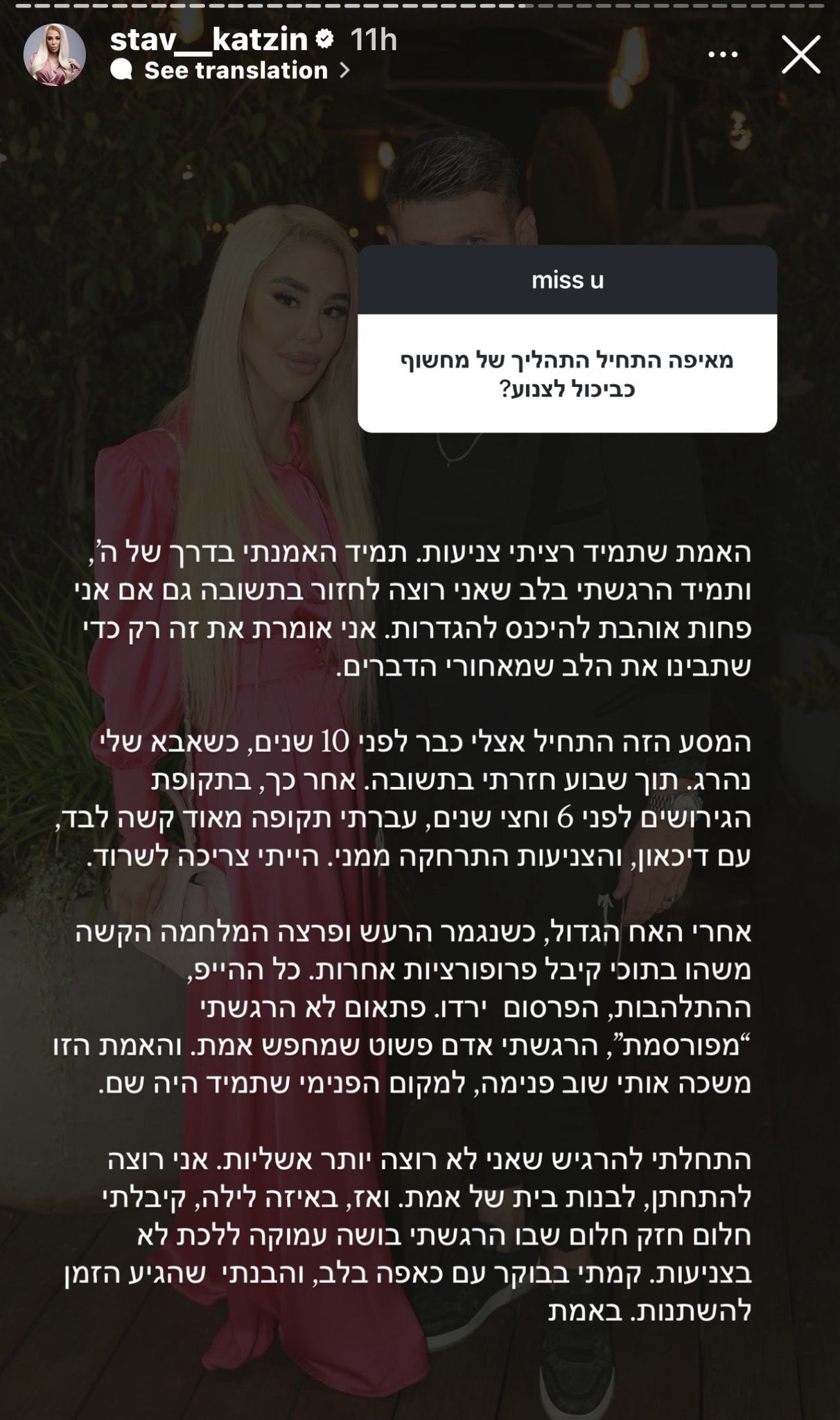 בסטורי חדש שהעלתה אתמול (שלישי) מתוך סשן שאלות - תשובות עם העוקבים שלה בעמוד האינסטגרם, קיבלה קצין שאלה על התהליך ממחשוף לצניעות וענתה: "האמת שתמיד רציתי צניעות. תמיד האמנתי בדרך של ה’, ותמיד הרגשתי בלב שאני רוצה לחזור בתשובה, גם אם אני פחות אוהבת להיכנס להגדרות. אני אומרת את זה רק כדי שתבינו את הלב שמאחורי הדברים.