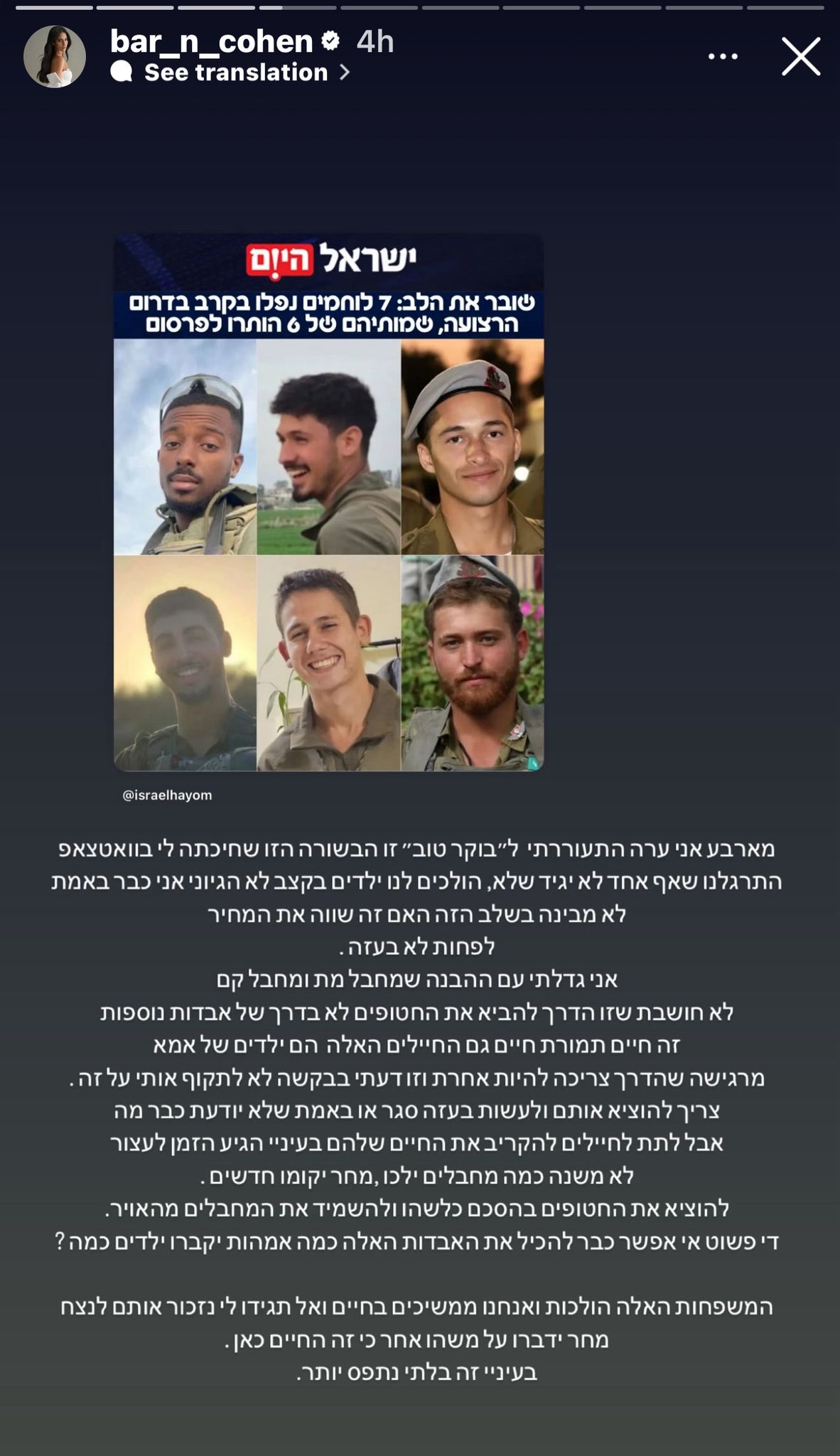 אני גדלתי עם ההבנה שמחבל מת ומחבל קם, לא חושבת שזו הדרך להביא את החטופים לא בדרך של אבדות נוספות, זה חיים תמורת חיים גם החיילים האלה הם ילדים של אימא, מרגישה שחייב להיות אחרת ודעתי בבקשה היא לא לתקוף אותי על זה. צריך להוציא אותם ולעשות בעזה סגר או באמת באמת שלא יודעת כבר מה, אבל לתת לחיילים להקריב את החיים שלהם בעיניי הגיע הזמן לעצור, לא משנה כמה ילכו, מחר יקומו חדשים"; צפו בסטורי המלא.