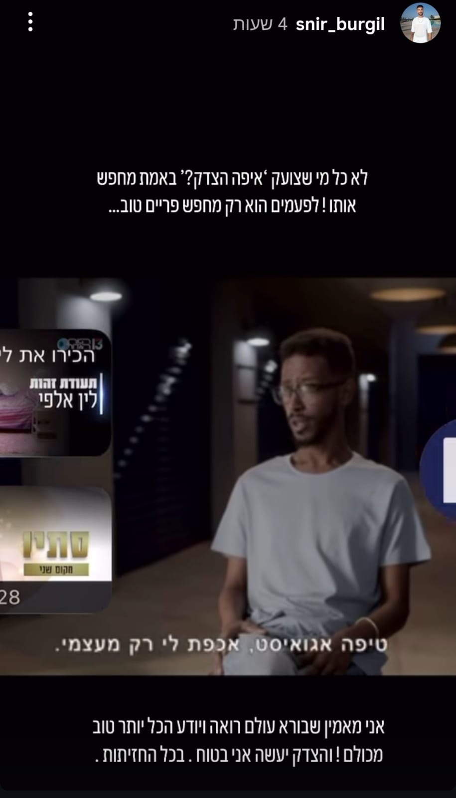 בורגיל, שכנראה רצה להזכיר לעוקבים את הצד הזה בגיסו, כתב על רקע הסרטון: "לא כל מי שצועק 'איפה הצדק?' באמת מחפש אותו! לפעמים הוא רק מחפש פריים טוב... אני מאמין שבורא עולם רואה ויודע הכל יותר טוב מכולם! והצדק יעשה אני בטוח. בכל החזיתות", סיכם שניר.