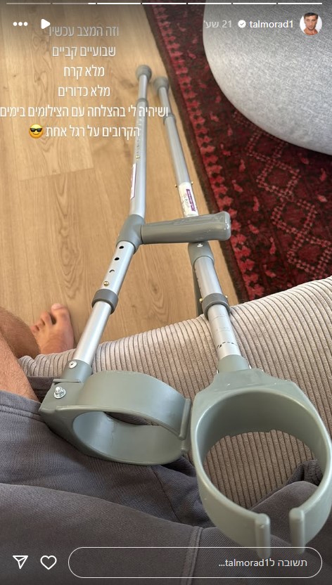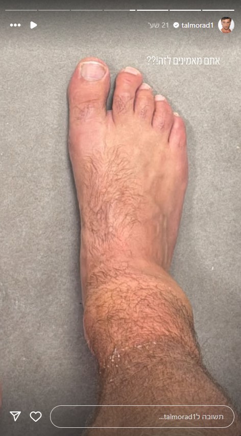 בהמשך, העלה סטורי לפני שחשף את רגלו וכתב: "אני אומר לכם אתם לא מוכנים לזה בוודאות". אחריו, העלה סטורי עם תמונה של רגלו הנפוחה וכתב ברקע: "אתם מאמינים לזה?". לסיום העלה סטורי נוסף בו צילם את רגלו עם כביים לצדה וכתב: "וזה המצב עכשיו. שבועיים קביים, מלא קרח, מלא כדורים ושיהיה לי בהצלחה עם הצילומים בימים הקרובים על רגל אחת".