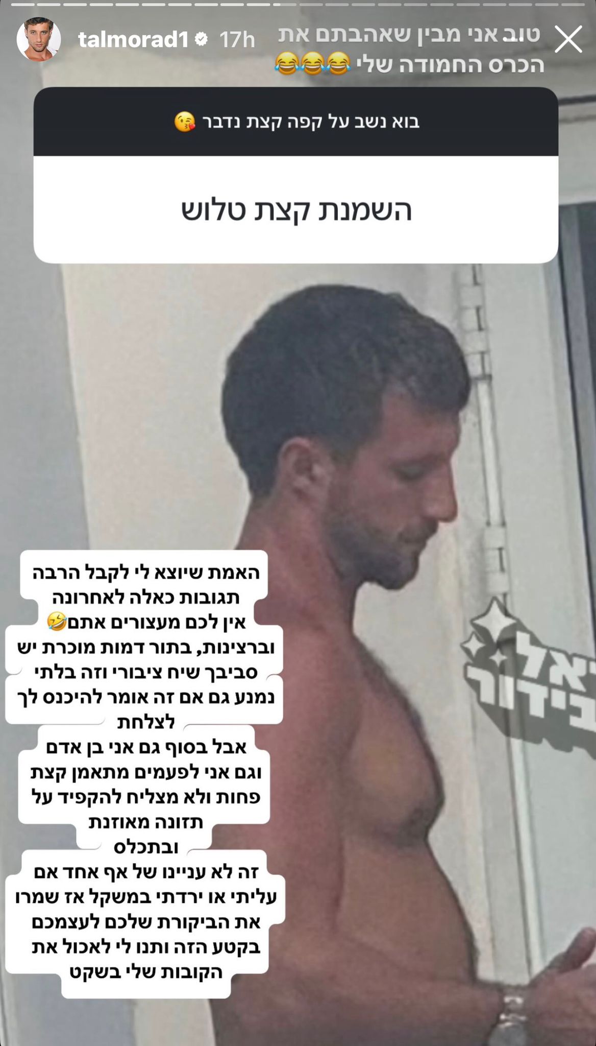 הדוגמן והשחקן טל מורד, העלה רצף סטוריז שאלות ותשובות, ושיתף את תחושותיו על משקלו: "תנו לי לאכול בשקט"