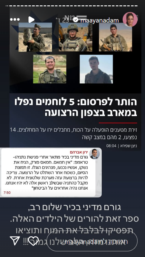 בסטורי שהעלתה לחשבון האינסטגרם שלה הבוקר, כתבה מעיין אדם, בתגובה לגורם מדיני שטען כי החמאס מפורק: "גורם מדיני בכיר שלום רב, ספר זאת להורים של הילדים האלה. תפסיקו לבלבל את המוח ותוציאו אותנו מזה, הלב שלנו גמור!!!". זוהי כמובן אינה הפעם הראשונה שמעיין אדם תוקפת את הממשלה, ומאז ה-7 באוקטובר ומותה הטרגי של אחותה מפל ז"ל, אדם מרבה לכתוב ולתקוף את הממשלה ואת העומד בראשה.