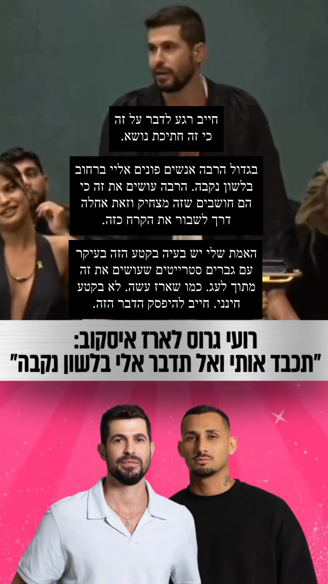 עוד המשיך וסיפר על התופעה שחווה: "האמת שלי יש בעיה בקטע הזה בעיקר עם גברים סטרייטים שעושים את זה מתוך לעז. כמו שארז עשה. לא בקטע חינני. חייב להיפסק הדבר".