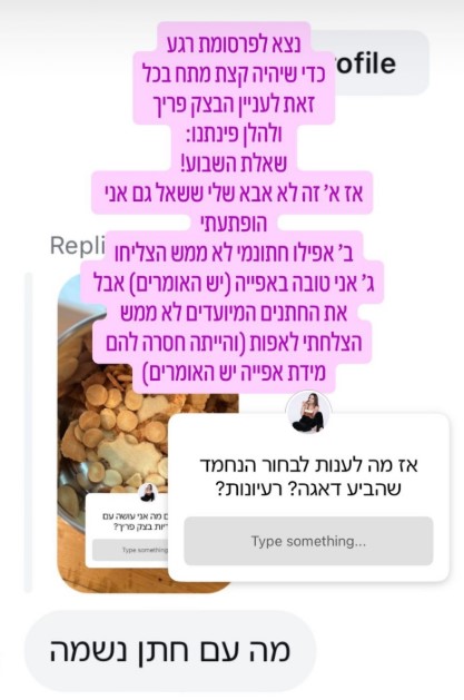 "נצא לפרסות רגע, כדי שיהיה קצת מתח בכל זאת לעניין הבצק פריך ולהלן פינתנו: שאלת השבוע!", כתבה בסטורי ששיתפה את התגובה.