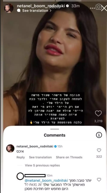 בסטורי שהעלתה הוא שיתף את התגובה שלה וכתב ברקע: "תגובה של מישהי שעוד מרשה לעצמה לעקוב אחרי ולדבר ככה על הילד שלי. אם רק הייתי יודע מי זאת הייתי שולח את יאנה שתיתן לה איזה כאפה שתחזיר אותה למציאות". לסיום תקף: "כלבה מטומטמת, עד הילד שלי".